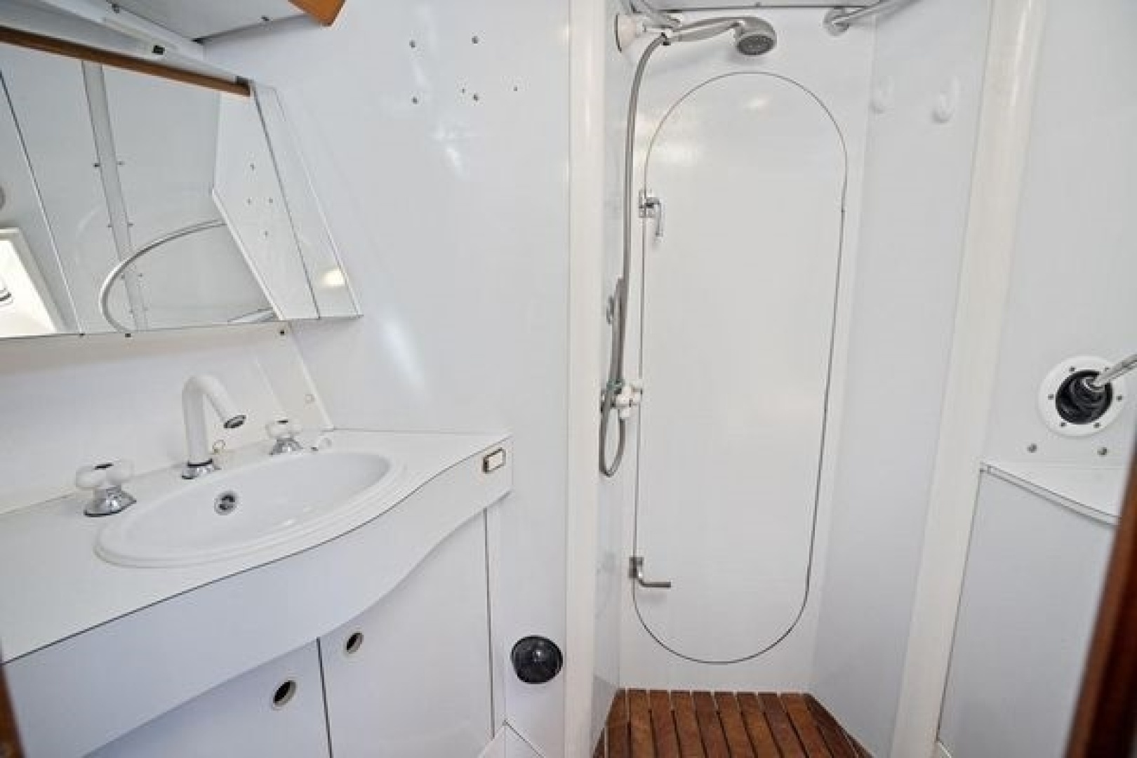 Large central cabin includes galley, Nav table, dining table w/ seating for eight people - Aft head/shower is accessiblefrom either port or starboard quarter berth cabins - Port quarter berth features stacked bunks and a stand up locker -Starboard quarter berth features a wide berth with storage drawers under - Forward, owners cabin has a Pullman berthwith high-quality IKEA mattress - Head forward of owners cabin has stand up shower and large overhead hatch - Superreliable Lavac heads with new pumps in both heads - Wallas Nautic 30D forced air diesel heater keeps owners cabinand main cabin toasty - Ultra Leather upholstery throughout main cabin 2017