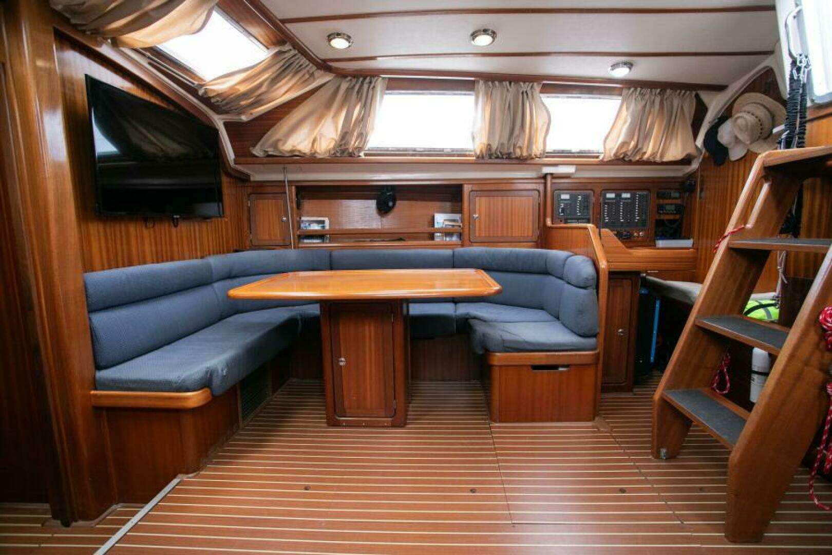 Below deck, Epoch provides a cozy and welcoming interior, with rich wood finishes, plenty of natural light, and a spacious, well-designed layout perfect for long-term cruising or full-time liveaboard living.