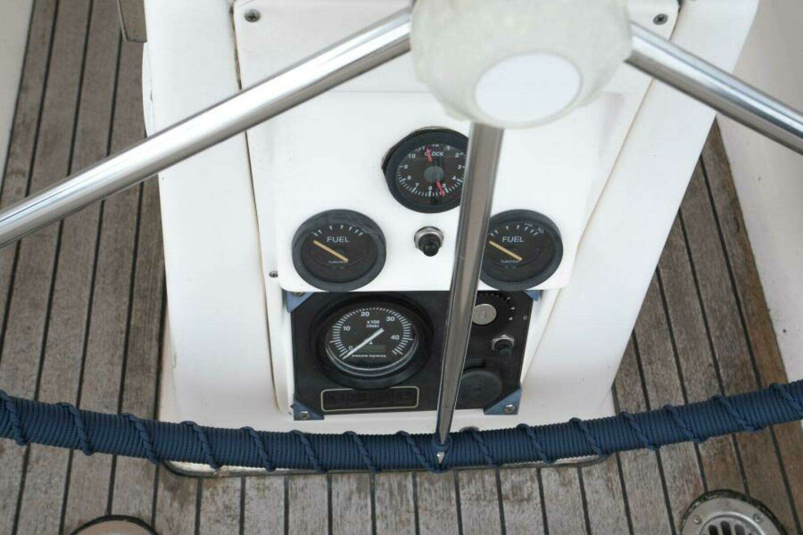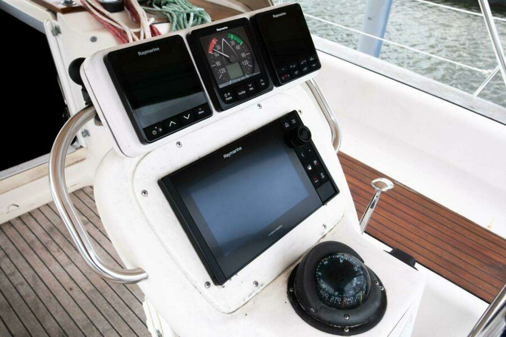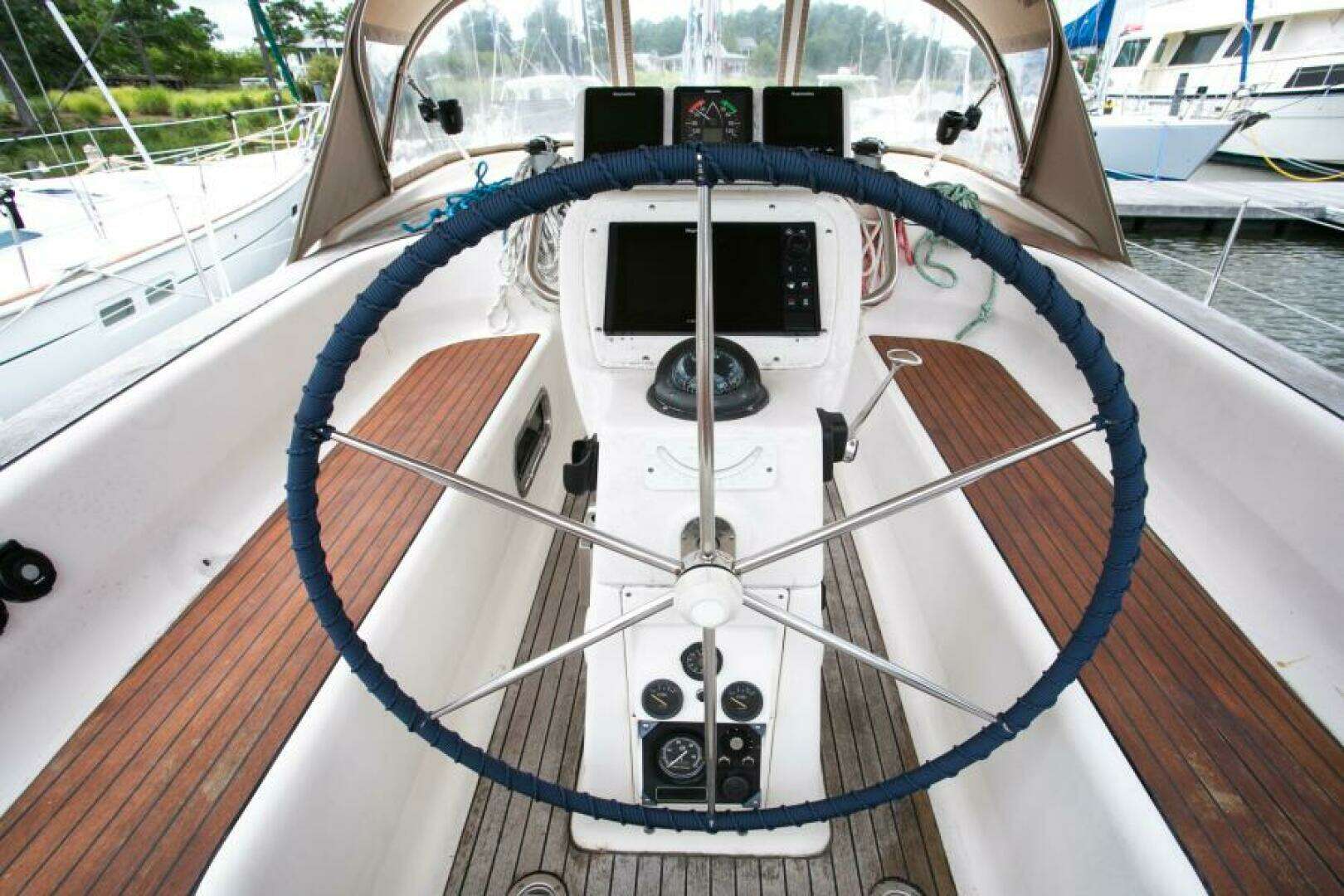 - Spacious, deep cockpit with solid teak seating and ergonomic helm