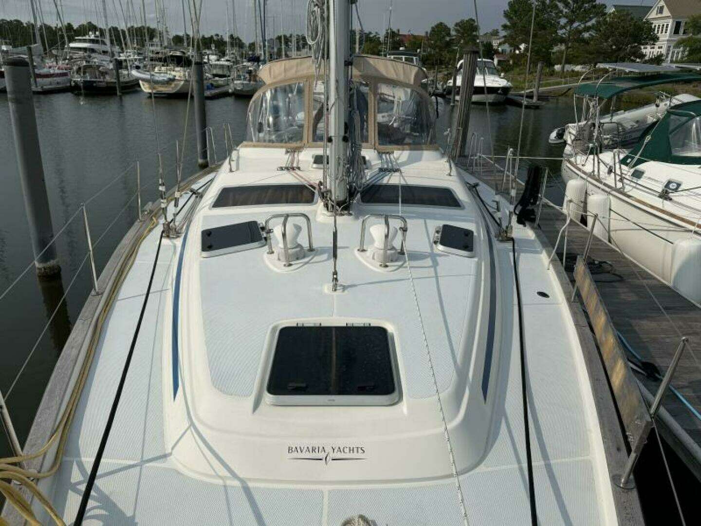 Bavaria's well-balanced spade rudder and wing keel, drafting 5'-7", provide exceptional upwind tracking and confident bluewater performance. She's stiff, surefooted, and surprisingly quick, with nearly 1,000 square feet of working sail area and a layout built for endurance and comfort.