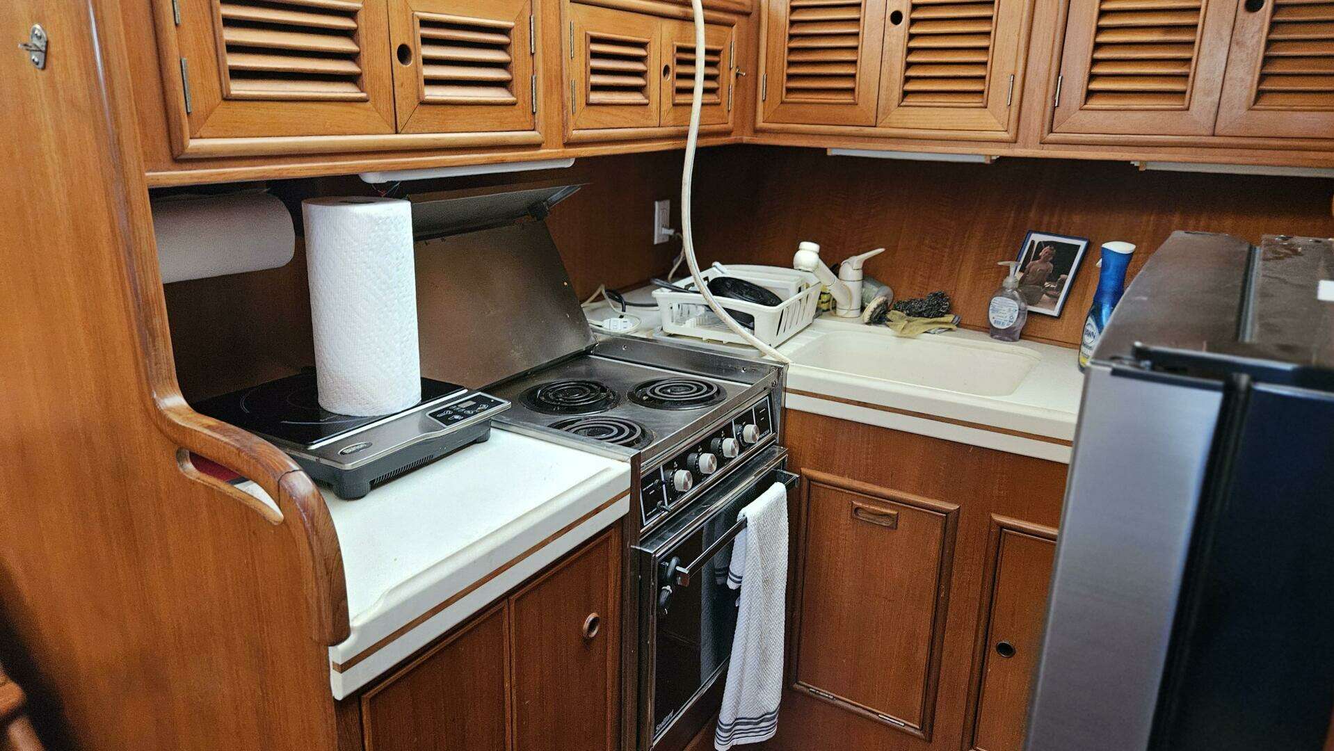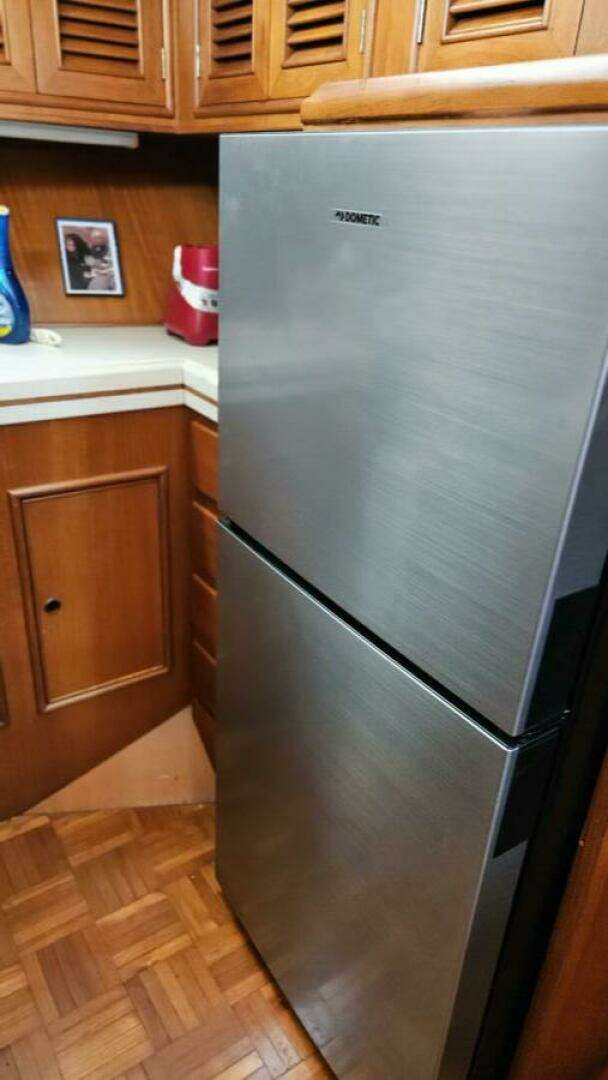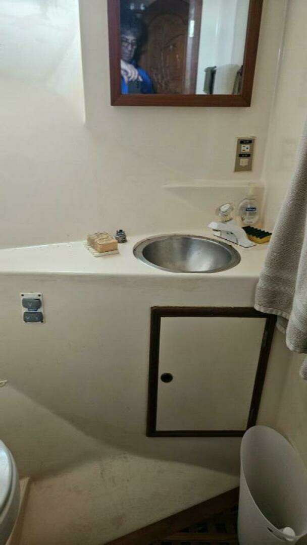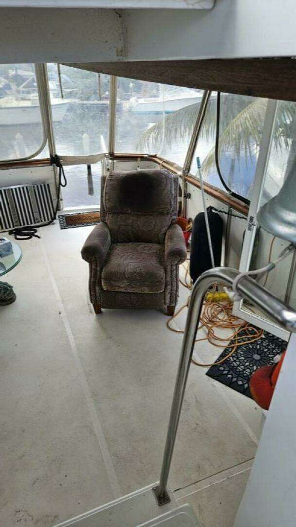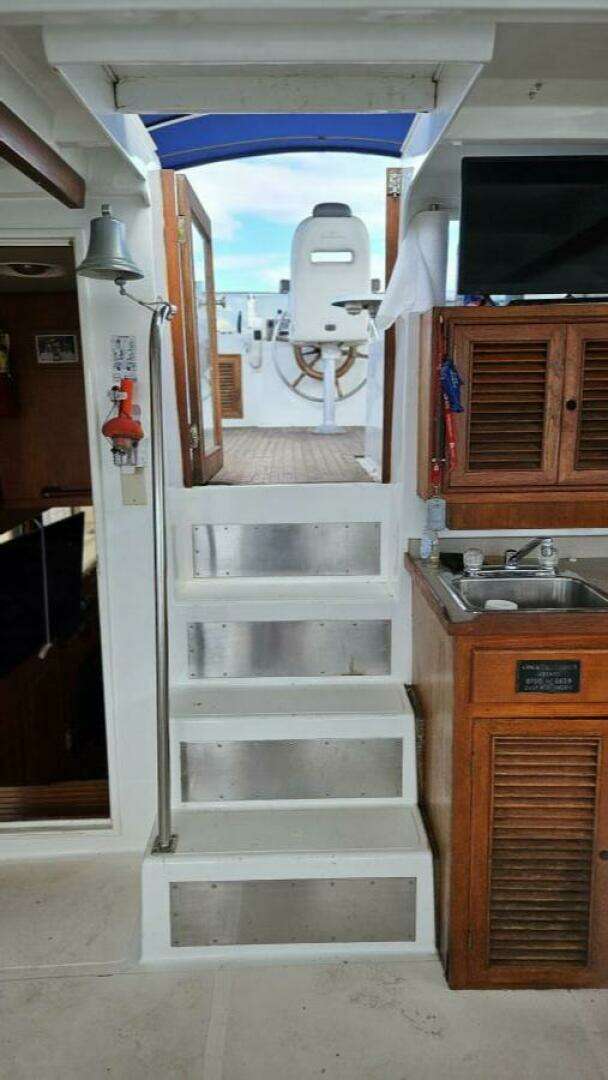 Adventure is a modified-V hull with a 15'4" beam and a full-length keel. The interior is roomy, with one state room and head forward, an aft midships office/stateroom with an adjacent head, and a full-beam owners' suite with an en suite head, a separate shower, and plenty of closet space with a built-in dresser. The interior features plenty of teak cabinetry, ample light, and ample storage. The galley is down and includes seating for four adults. The aft deck is roomy and enclosed with roll-up windows and a wet bar. The flybridge is extensive, with plenty of seating for guests, and the side doors open onto both side decks for easy forward movement.