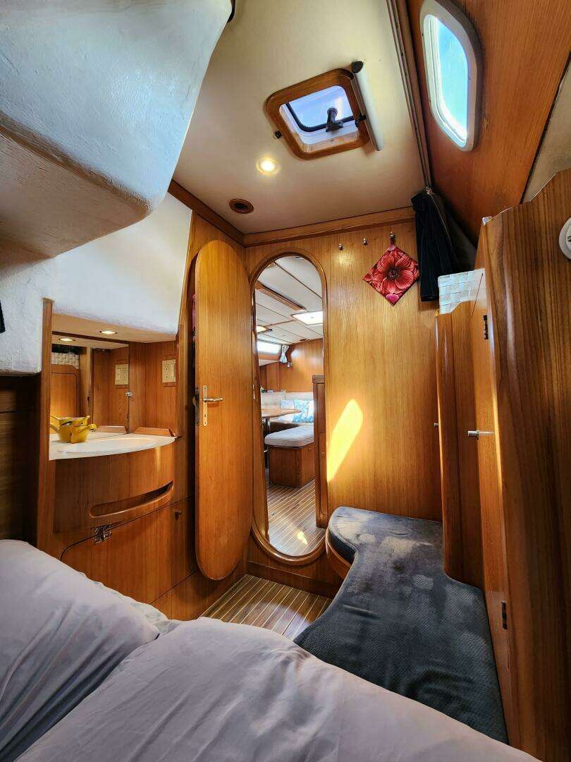 Stepping down the companionway you are greeted with a well lit salon with warm wood tones and a nice breeze from the ample overhead hatches and 6'5" of head room. To port is the large C-shaped salon table with seating for 8 and storage throughout. (So much storage on this boat!) To starboard, is the nicely appointed galley with ample counter top space, large top-load fridge and loads storage. Pull out trash bin, newer (2017) Force10 stove/oven and a unique layout for cooking with ease. Aft of the galley is the nav station with all instruments & breakers within arms reach and a large plotting table. Aft of the companion way to port and starboard you will find the two identical double berth cabins, each with bench seating and a sink int he cabins. To port is the guest head and shower. The owners cabin is forward with a double V-berth with small bench and dresser. Just aft is the master head & shower and adjacent is the crew bunk cabin that sleeps two or can be used for extra storage.
