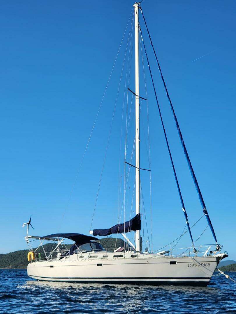 Designed by Gilles Vaton, the Feeling 486 excels as a capable passage-maker, thanks to her long waterline, efficient sail plan, and sleek lines. She delivers impressive speed and upwind performance with the inner staysail (solent), while the genoa shines on broad reaches—perfectly suiting her name, 'Long Reach'. Yet she's remarkably easy to handle, even single-handed, with a thoughtful hull form and secure cockpit that prioritize safety and comfort offshore.