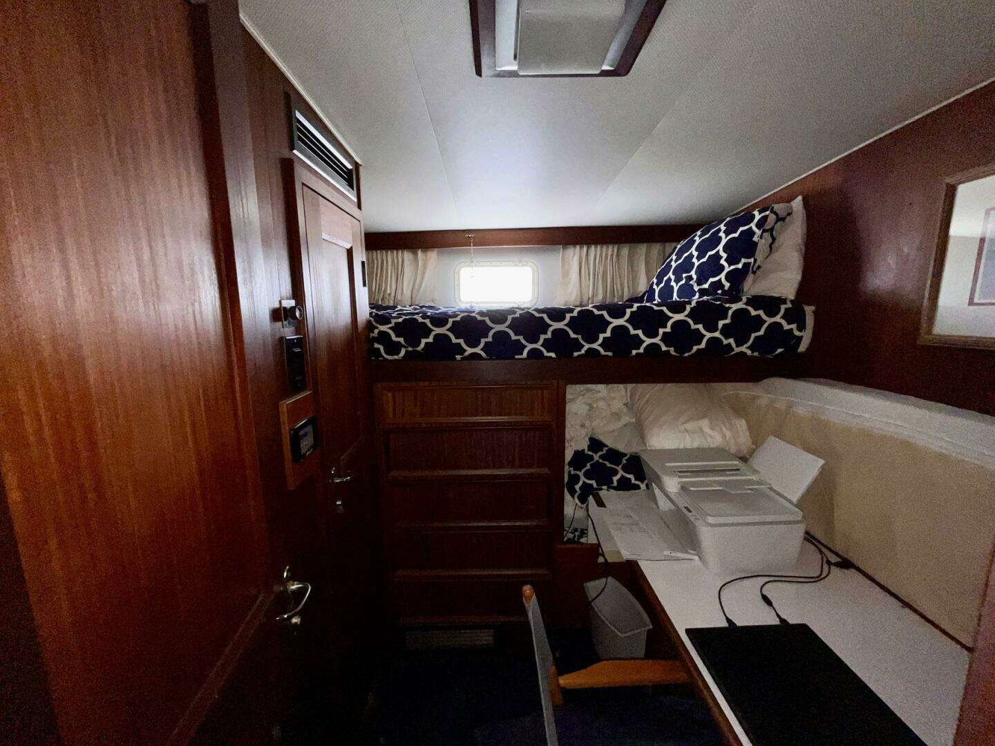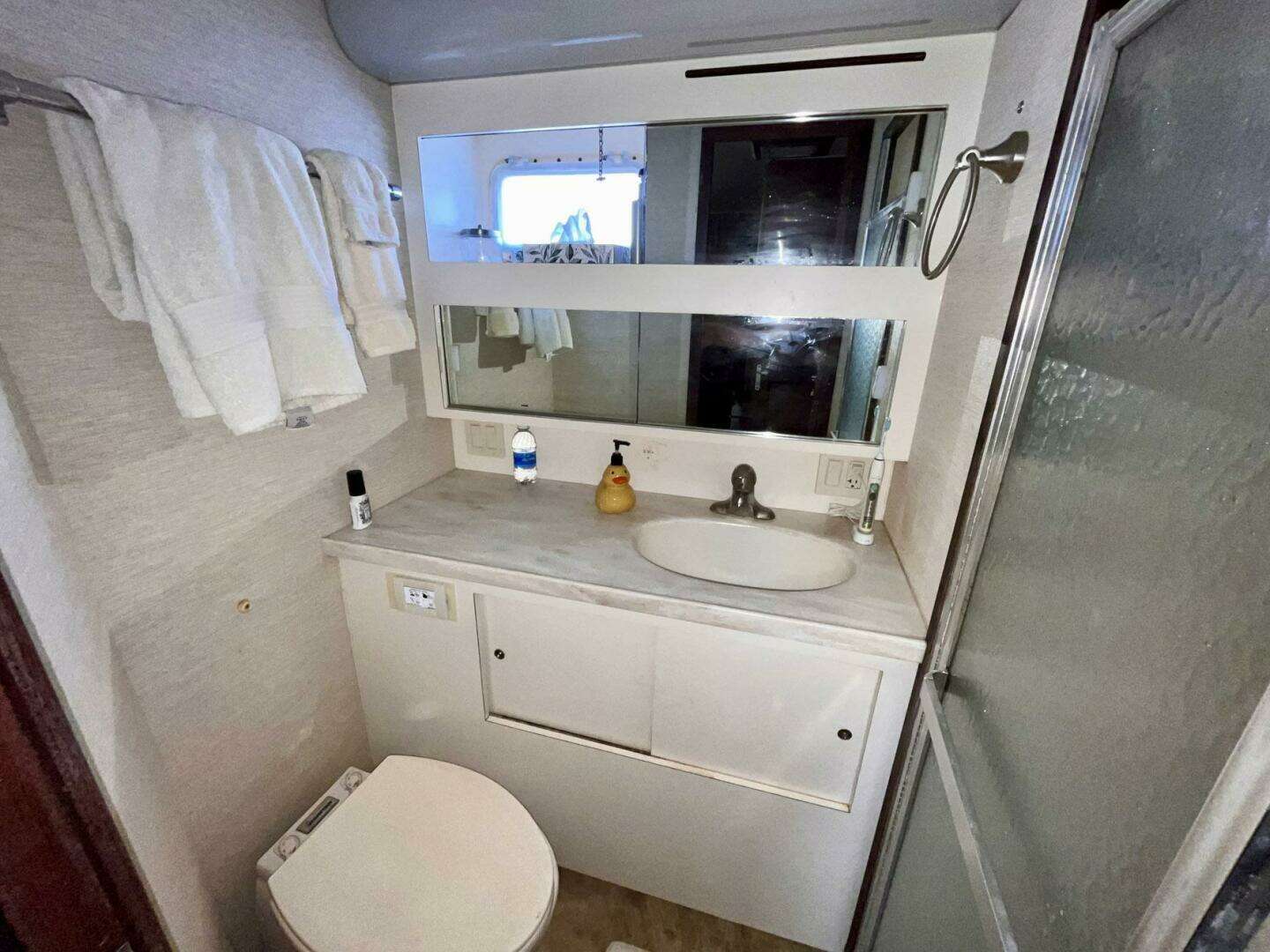 Transiting aft from the salon leads you to a stacked washer/ dryer combination unit. The guest cabin is convertible with two bunks and storage, or an office with the aft bunk custom designed to fold up out of the way exposing a working desk and chair. The second head is located across the hall and also includes a separate shower.