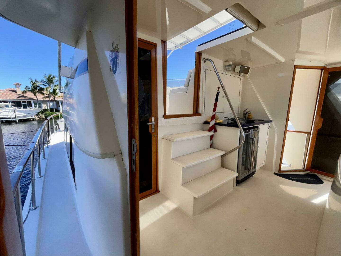 As you approach “Rubber Ducky” you’ll appreciate the shine in its Awlgrip finish. It comes with a boarding ladder or folding stair utilized on either side for boarding. Once aboard, the wide decks allow ease of access forward to the working bow or through the smoked glass wing doors to the spacious aft deck. The aft deck is fully enclosed or can be easily opened to the let the fresh sea breeze flow through. There is ample space to entertain many people while preparing your bbq in the rain or shine. The refit bar includes large storage space, a wine chiller, and preparation sink.