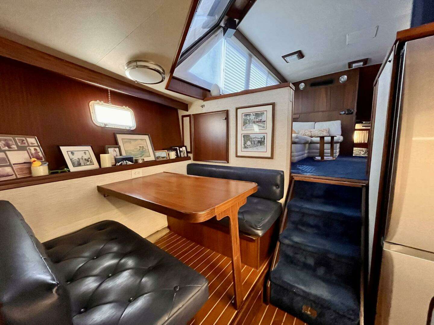 Enjoy panoramic views from the flybridge, which features Garmin electronics for modern navigation and a hardtop with eisenglass enclosure for year-round comfort. The aft deck offers a wonderful setting for entertaining, dining, or simply enjoying the sunset at anchor.