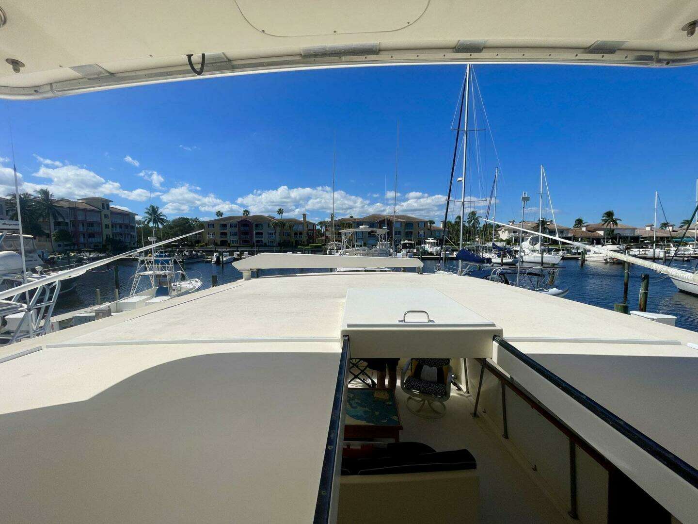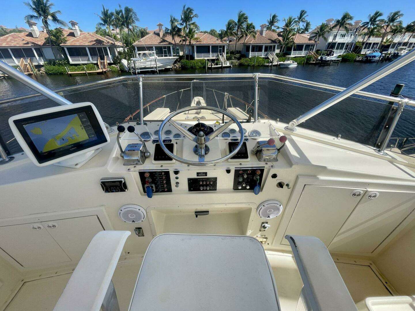 The companionway up leads you to a spacious flybridge enclosed under a new hardtop. Lots of comfortable seating surround the helm for all to enjoy the cruise together. Large storage space is utilized in the brow forward of the helm. The Captain will appreciate ease in command with a full Garmin Navigation suite at your fingertips. Whether you’re cruising the ICW in comfort or crossing to the Bahamas, you’ll appreciate the sea keeping stability that Hatteras is known for. .
