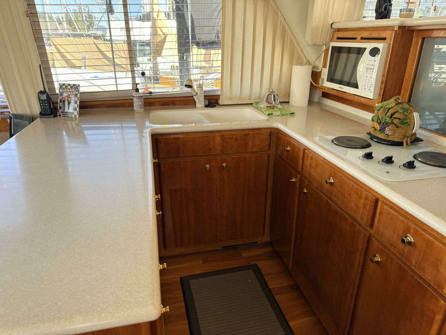 The galley forward to port is well-equipped for short or long trips, featuring: