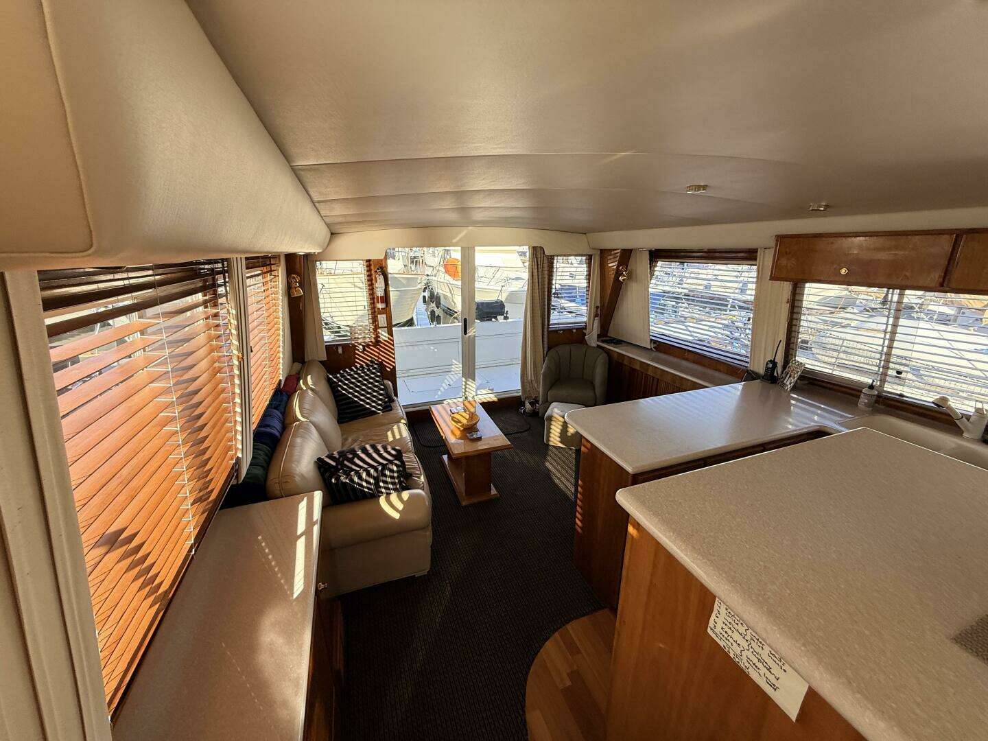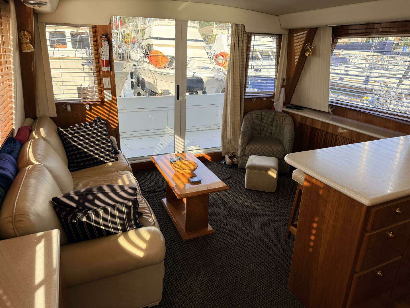 The salon is bright and inviting with cherry cabinetry, Venetian blinds, a starboard-side couch, single port chair, and two stools at the breakfast bar. Entertainment includes a flat screen TV with Bose sound bar and stereo system in the port cabinet.