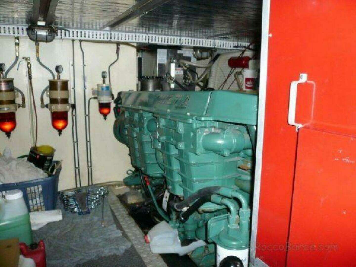 The engine room is located under the salon and is accessed by lifting the stairs in the galley area. Headroom in the engine room is about four feet but for the lengthy service procedures there are overhead hatches which are removable and which allow full stand-up position.