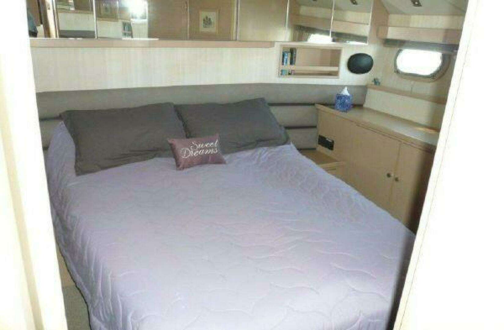 The master stateroom is all the way aft and has a centerline queen berth, many built-in cabinets and a sit down dressing table. The ensuite head (electric) and stall shower are forward to port.