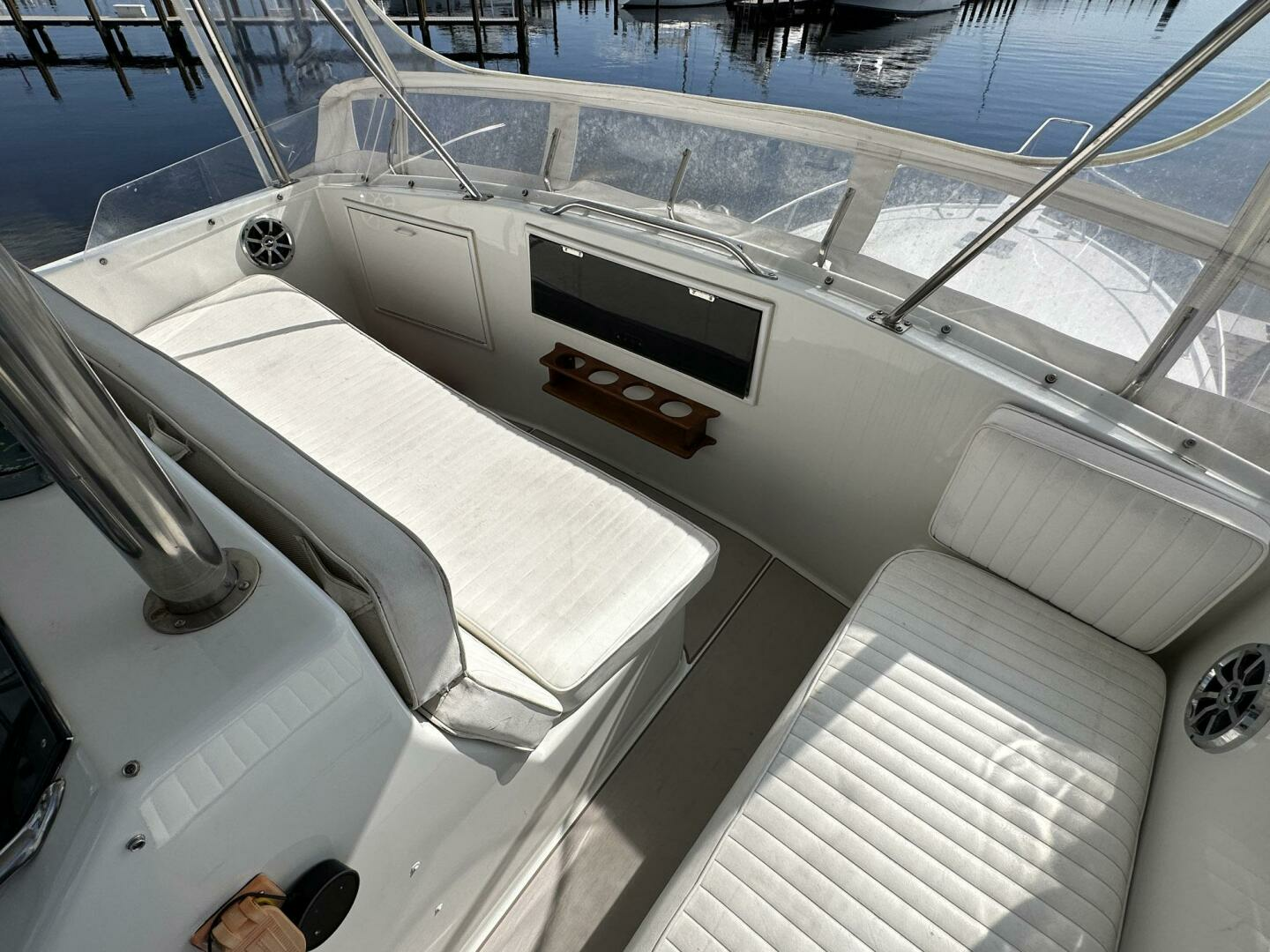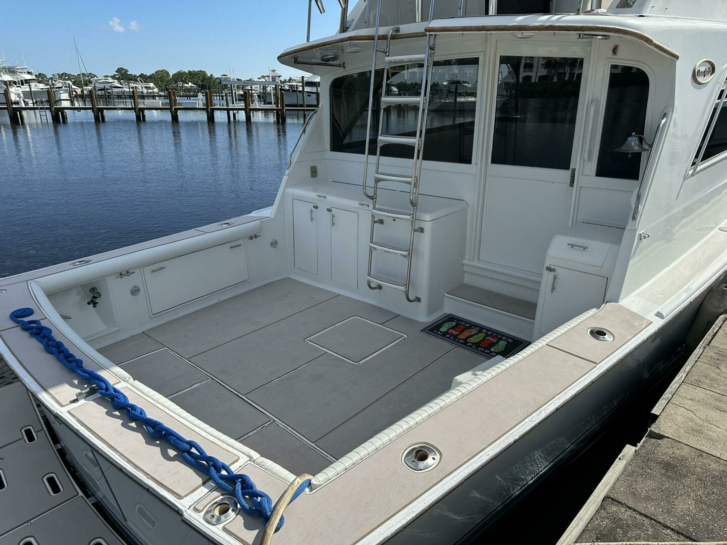 Moving aft and starboard, at the exit to the cockpit you will find the main engine room access hatch in the cabin sole. Moving out of the salon and into the cockpit which features all NEWER LIGHT GREY SEADECK decks that are in excellent condition, an almost full beam, a below deck fish box and large double well bait tank. The cockpit also features a full bait prep station with bait freezer, and sink to port and a large tuna door on the transom. The flybridge has a fiberglass hardtop, three helm chairs, complete array of electronics (GPS, Radar, Autopilot, VHF), additional bench seating forward and to starboard. The bridge is also fully enclosed with all NEWER isinglass.
