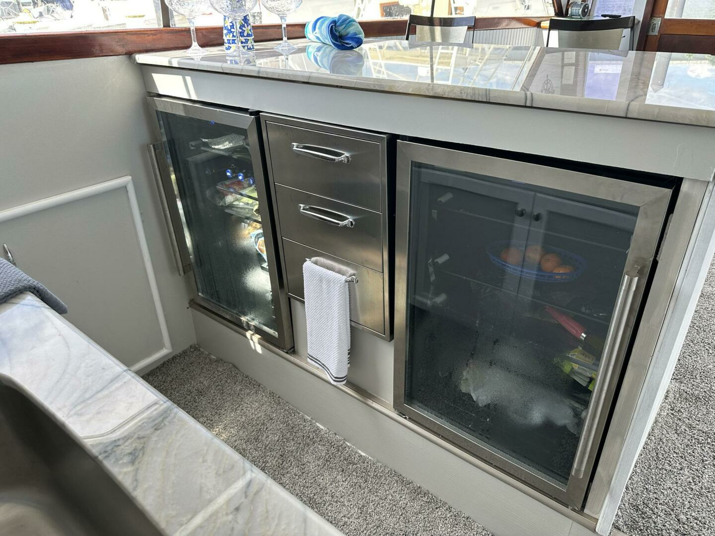 Starting forward is the anchor locker and then the forward master stateroom with large island double/queen berth, all NEW color LED lighting, en-suite private head/stall shower with all NEW flooring, NEW quartz counter tops, NEW faucets, hanging lockers and ample storage. Just aft to port, is the shared guest head/stall shower with companionway and stateroom access (port guest stateroom only), followed by the port guest stateroom. This stateroom has twin lower berths and ample storage with hanging locker and drawers. Across is the starboard stateroom with an upper athwart ship berth and lower berth that is long enough to sleep 6’+ individuals, hanging locker and storage. Up the companionway stairs leads to the galley and salon. The galley is U-shaped and located on the starboard side and features a large granite countertop that doubles as a breakfast bar with bar stools, dual SubZero refrigerator and freezer with stainless-steel drawers between them. New three-burner Force 10 stove top/oven. Then you look up and see this amazing NEW stretched PCV ceiling that illuminates different colors depending on its surroundings--IT’S A SHOW STOPPER!
