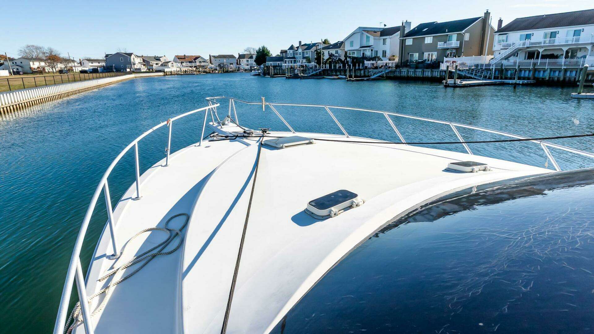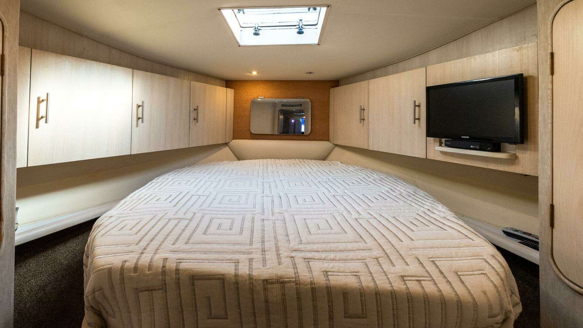- Forward bow, aft facing queen-sized mattress