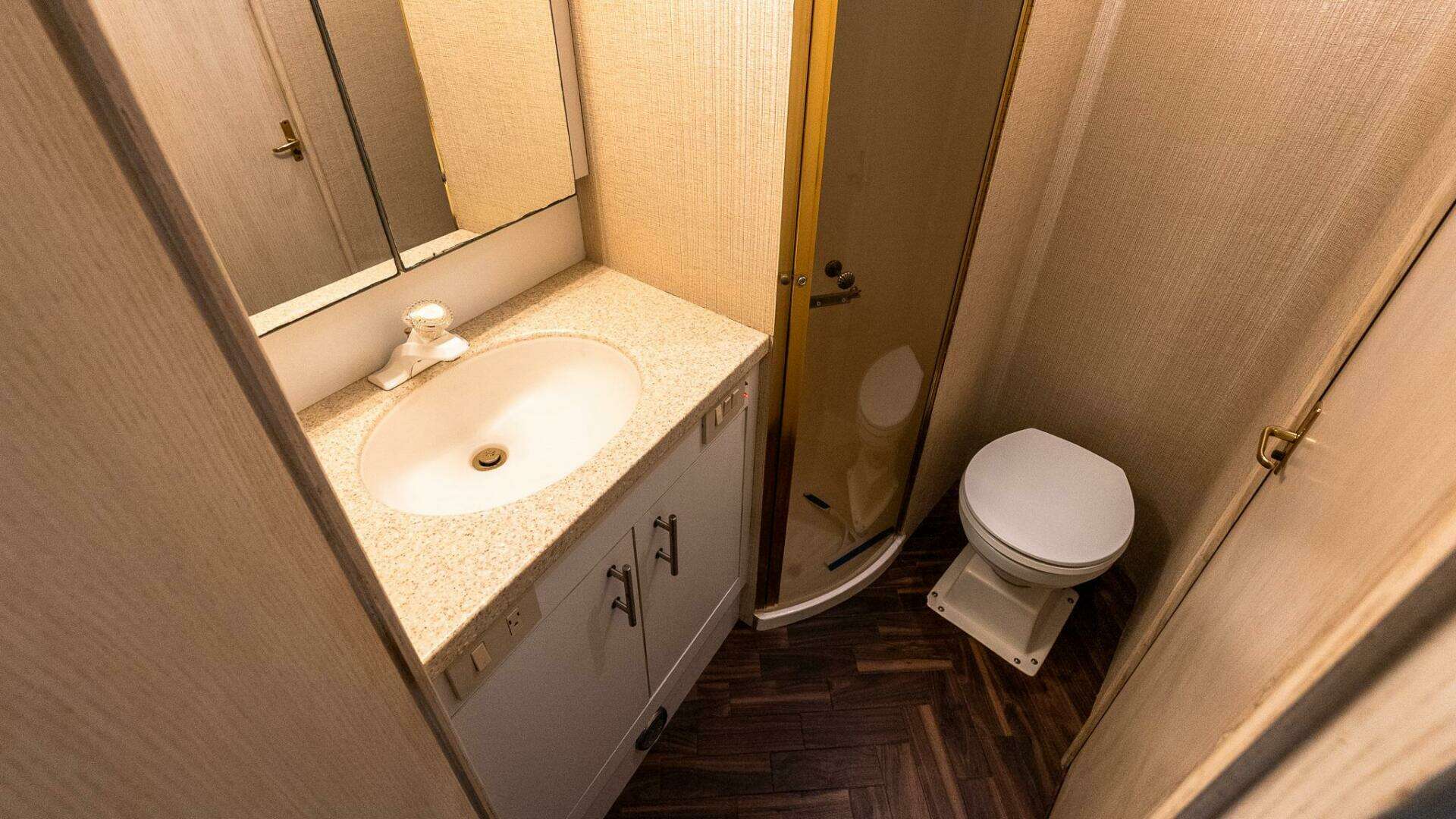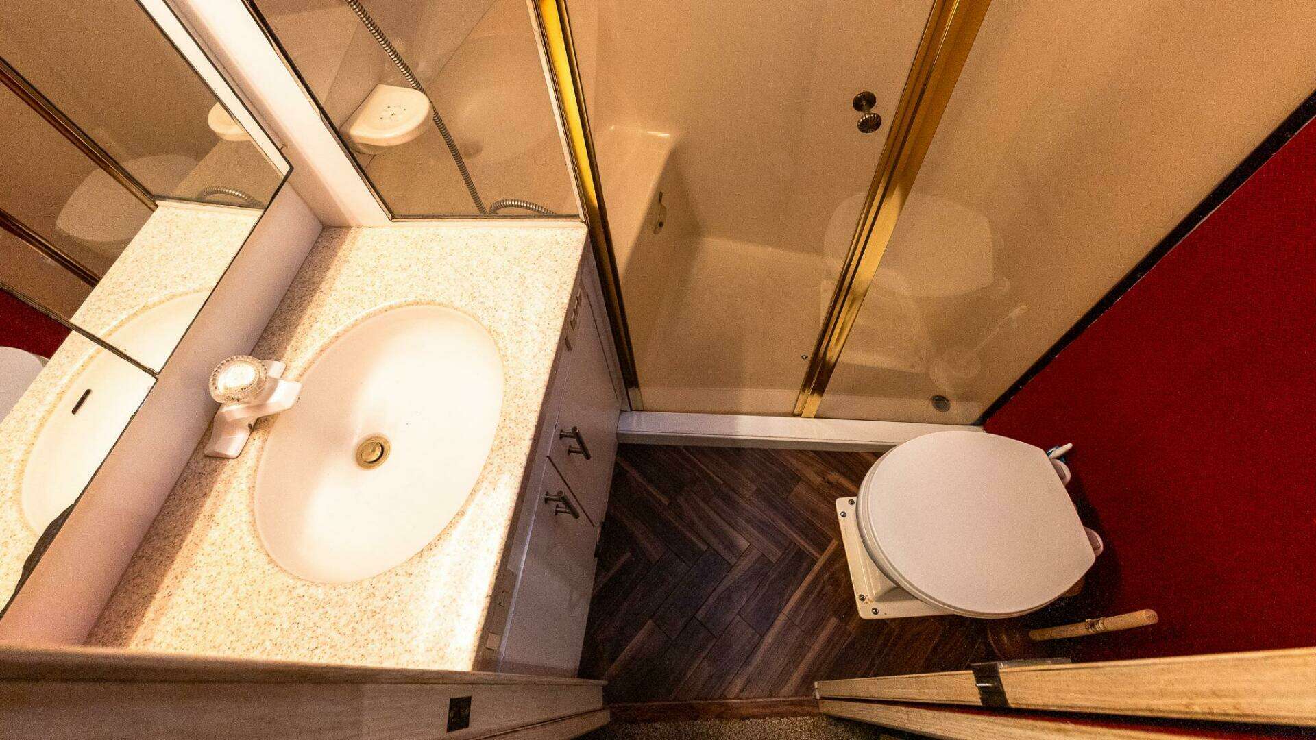 - V-berth cabinet storage on either side