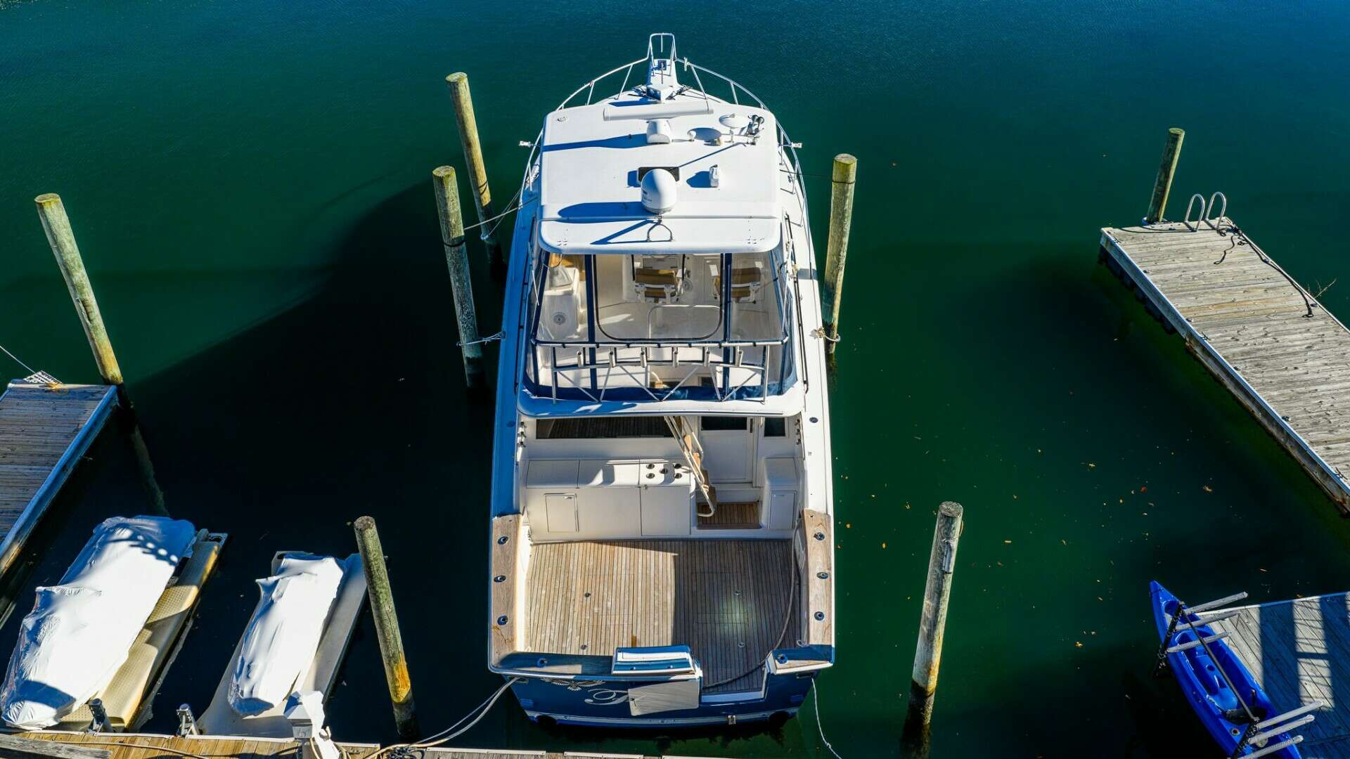 "Falcon" is an Ocean 48 Super Sport that has benefitted from a series of desirable upgrades that keep her looking her best, including many in 2017 such as a beautiful blue painted hull, Amtico flooring, carpeting, teak decks, and landing covering board. Enjoy Southco hardcover and shocks on all hatches, along with powder coated bridge rails and ladder.