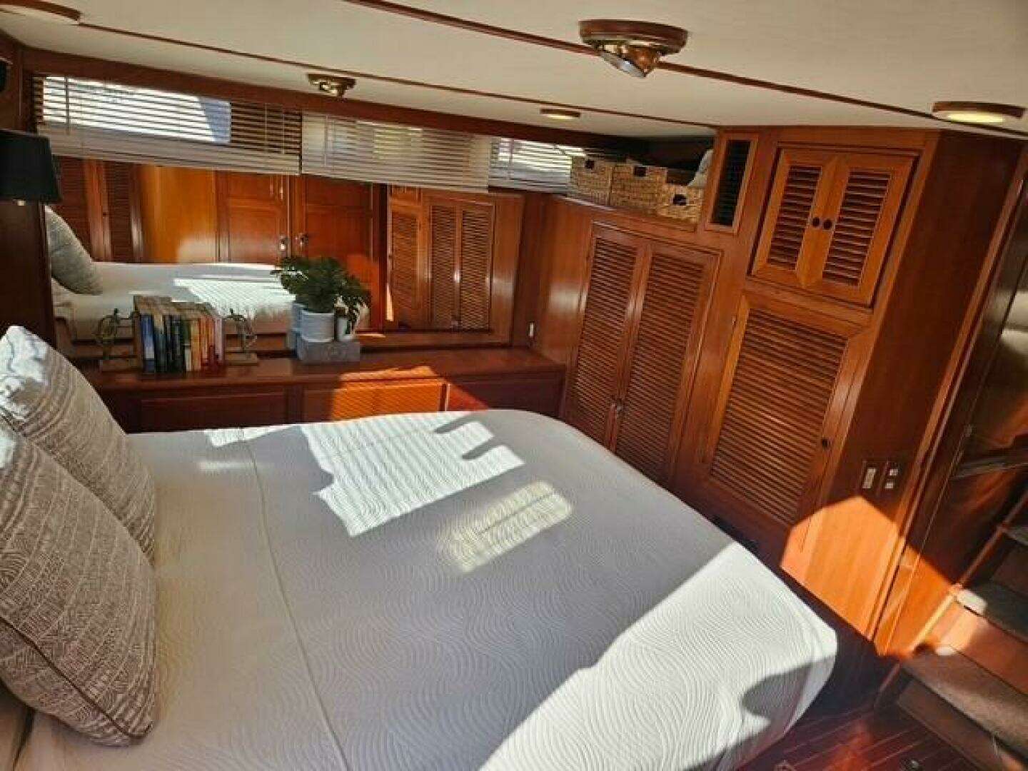 The Southern Flite, a 1990 Offshore 48 Yachtfish, presents a traditional aft cabin cockpit motor yacht design with a trawler-esque aesthetic and adaptable interior. Featuring a two-stateroom configuration, it includes a spacious salon, a galley down, a master stateroom aft and a forward full berth,