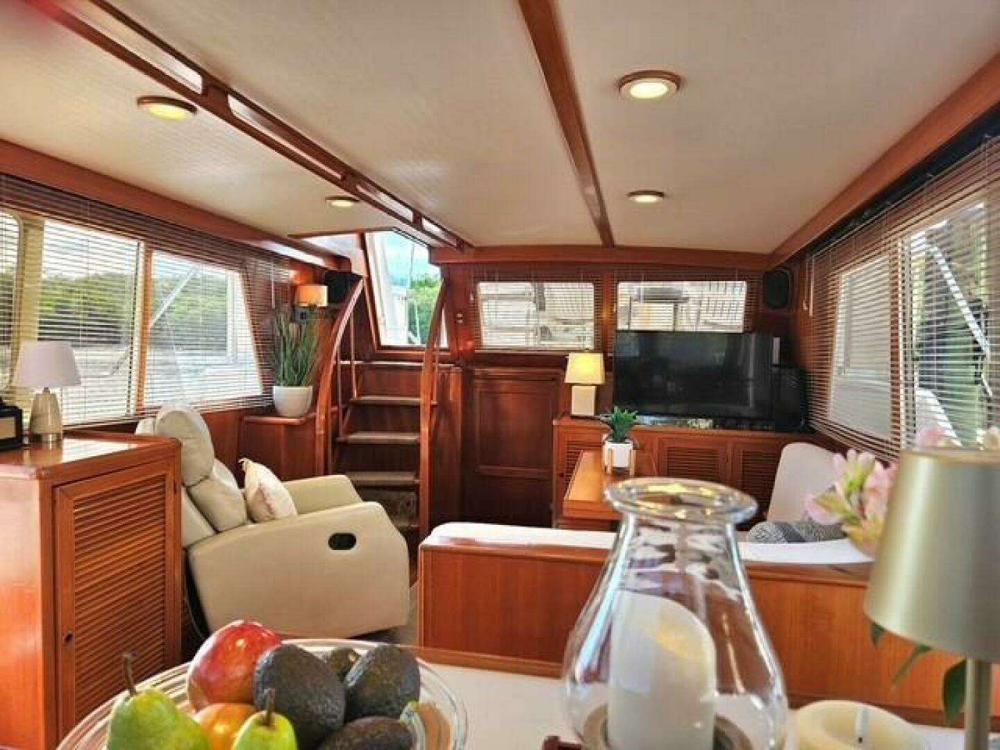 The large, comfortable salon is accessed a few steps down from the aft deck. Forward and down a few steps is the galley; full forward is the guest stateroom with private head. From the salon, a staircase leads down to the master stateroom, all the way aft, fitted with full walk-around berth and private head/shower. Teak and Holly flooring thru-out the yacht salon, master SR, Galley, and forward stateroom.