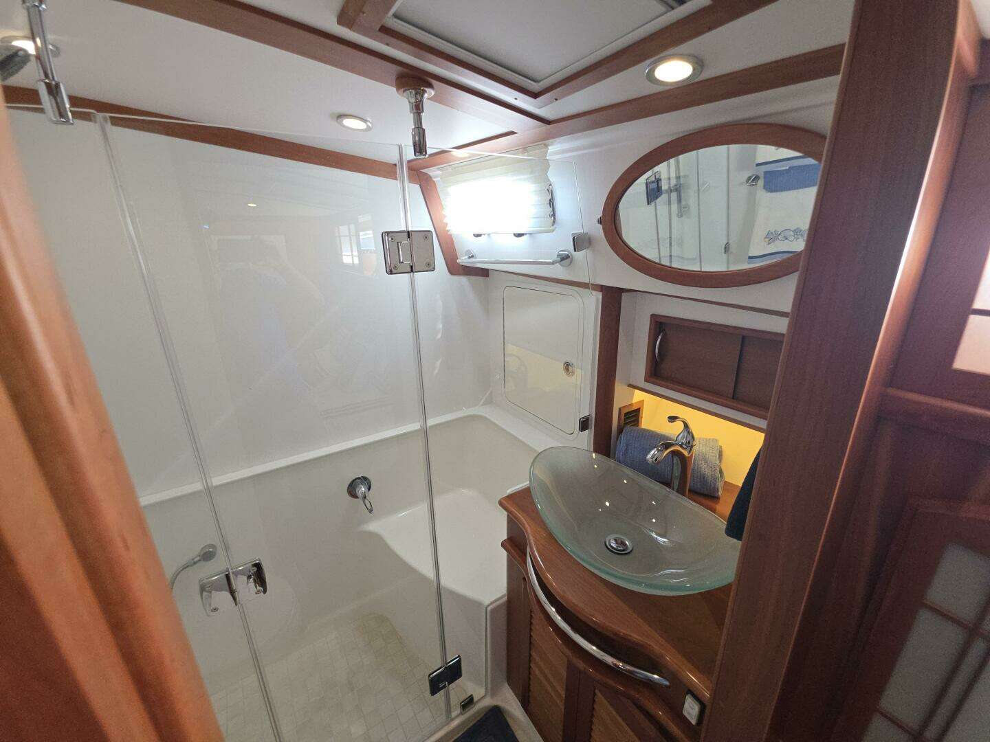 - Master stateroom amidships with queen size island berthGuest cabin forward with queen sized island berth