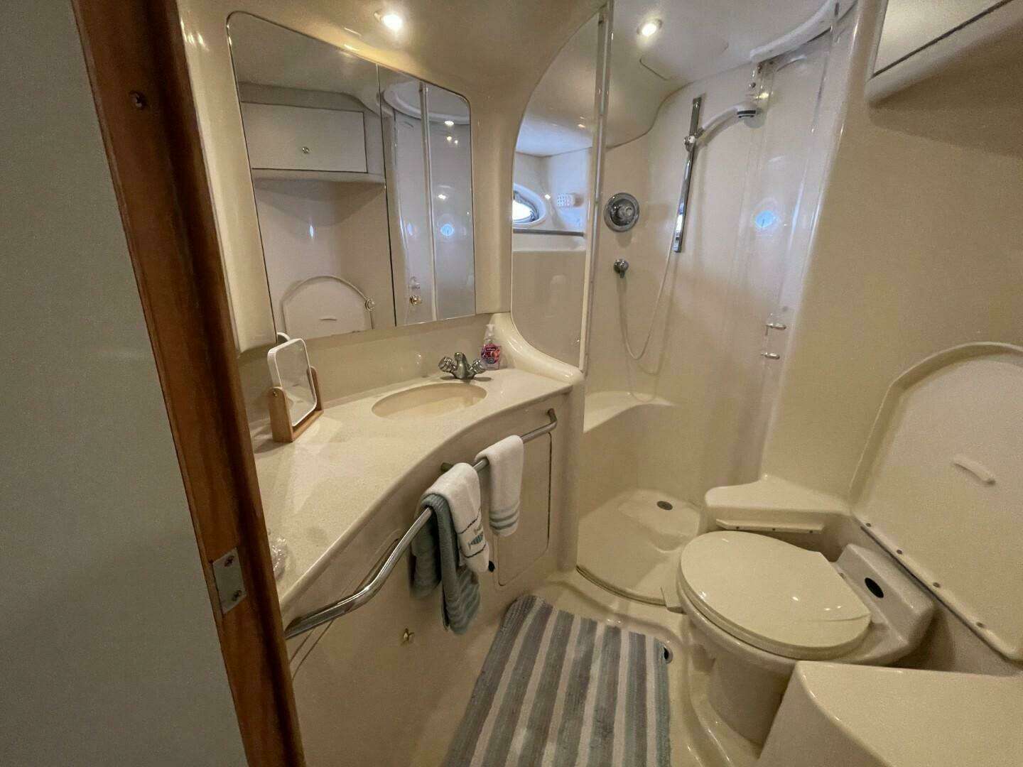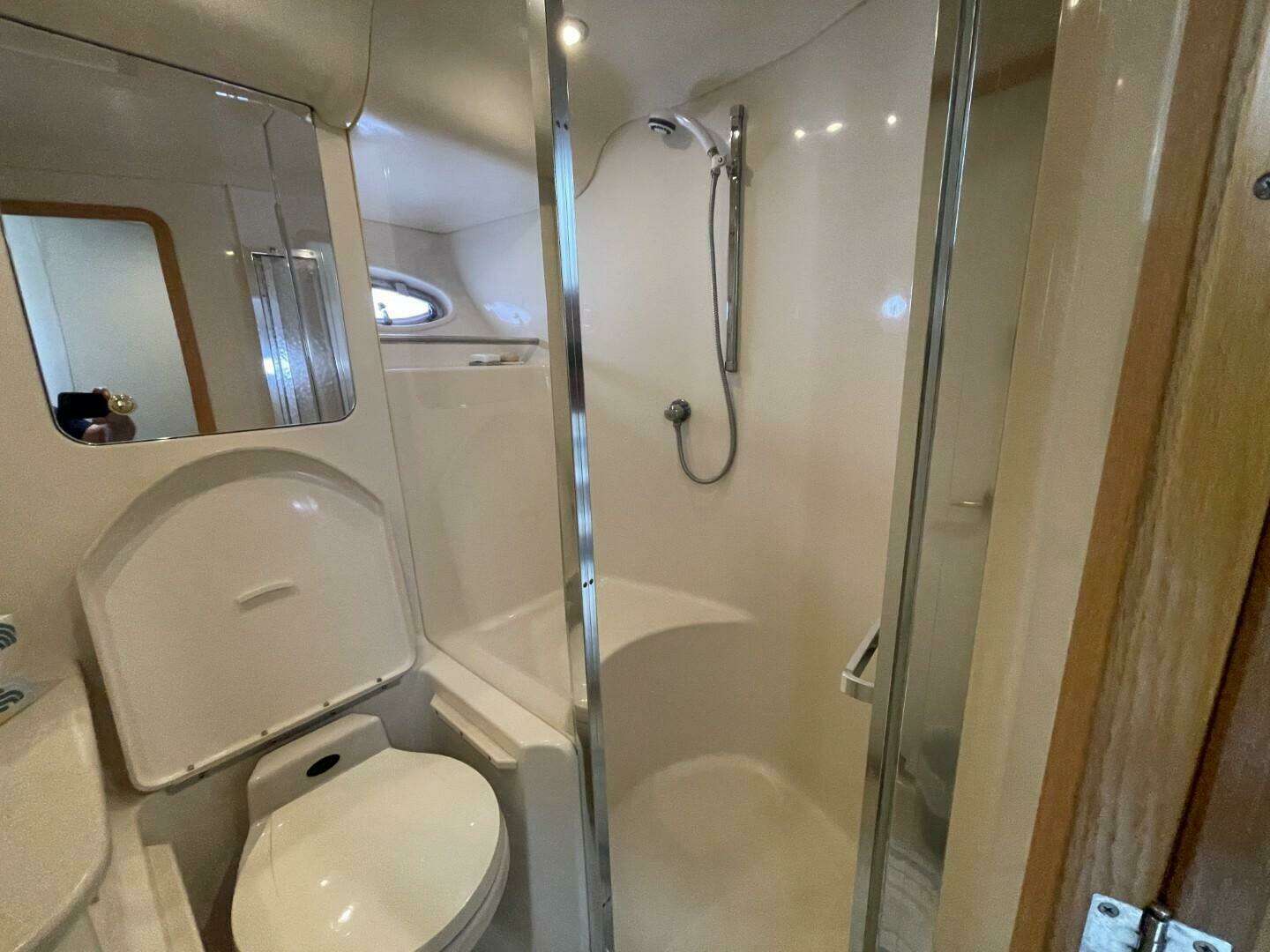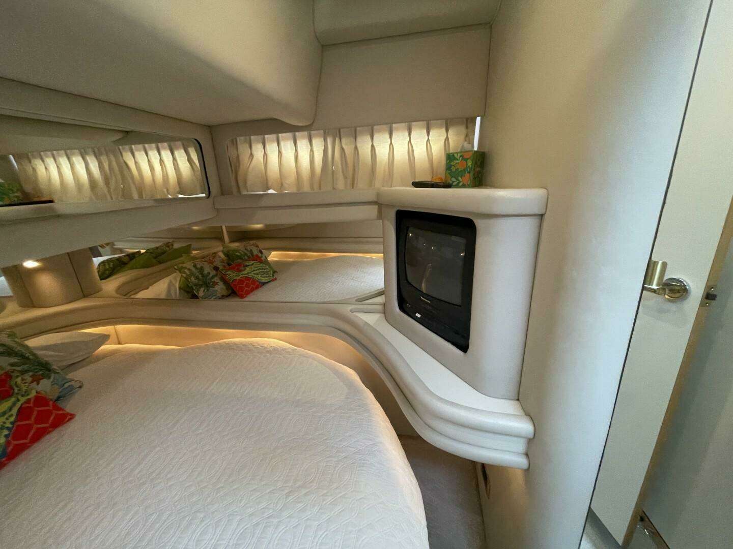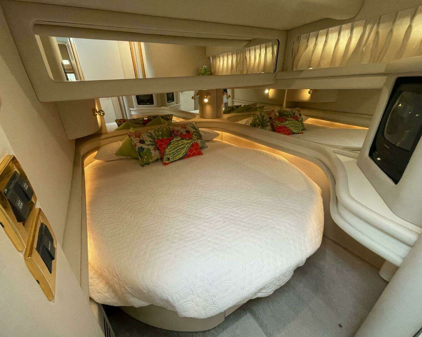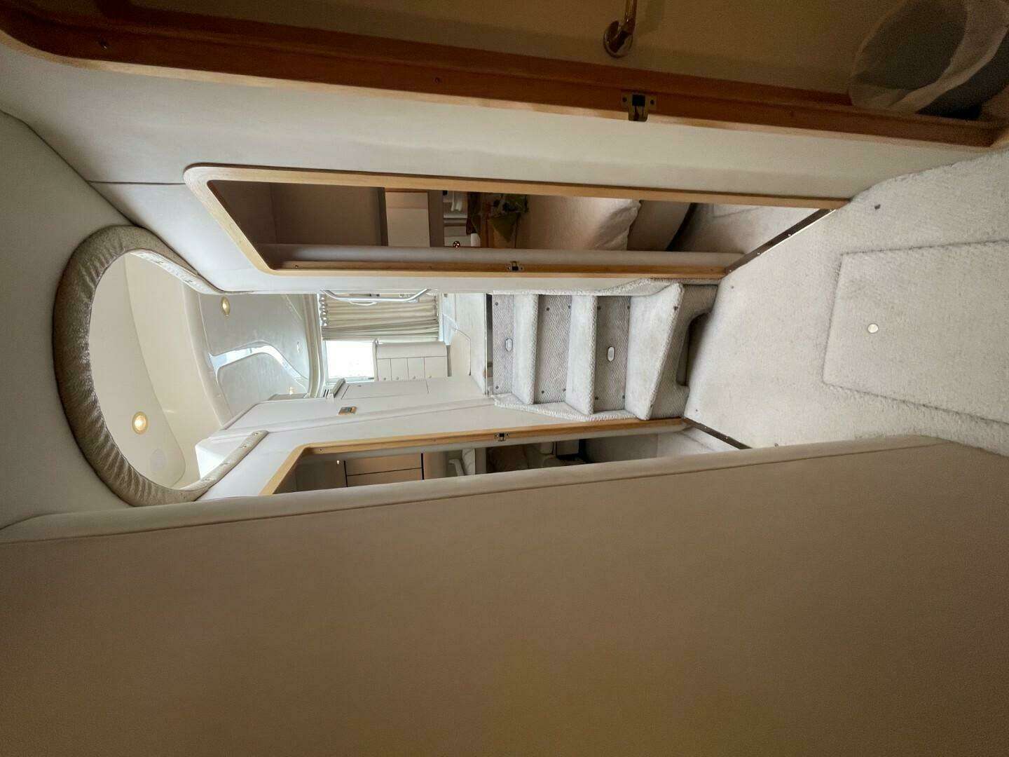Starting as you board her from the large Swim Platform, you enter her cockpit which has been enclosed to make a great outdoor sitting area. She has a large storage hatch in the transom along with a bench seat. Her engine access is through a large hatch in the cockpit sole. Her cockpit, stairway to the bridge and bridge deck is on the port side. The stairway to the bridge is wide and easy to navigate. Her bridge is large and has her helm station with two swivel seats, a wet bar and l-shaped lounge forward, all kept comfortable by the reverse cycle heat and air. From the cockpit you enter her cabin via a sliding glass door and the first area is the salon, dinette and galley area. She has a settee along the port side that is electronically converted into a berth with the dinette forward. Her starboard side has an occasional chair and entertainment center, a country kitchen bar and galley forward. You move down the companionway steps and her guest cabin is to starboard and features an upper and lower berth that converts to a settee and is home to her washer/dryer. Her VIP Stateroom is to port and features a queen berth and entrance to the Guest Head (it also has an entrance from the companionway). All the way forward is her Master Stateroom which has an Island Queen Berth, Storage and entrance to the Master Head which is very impressive.