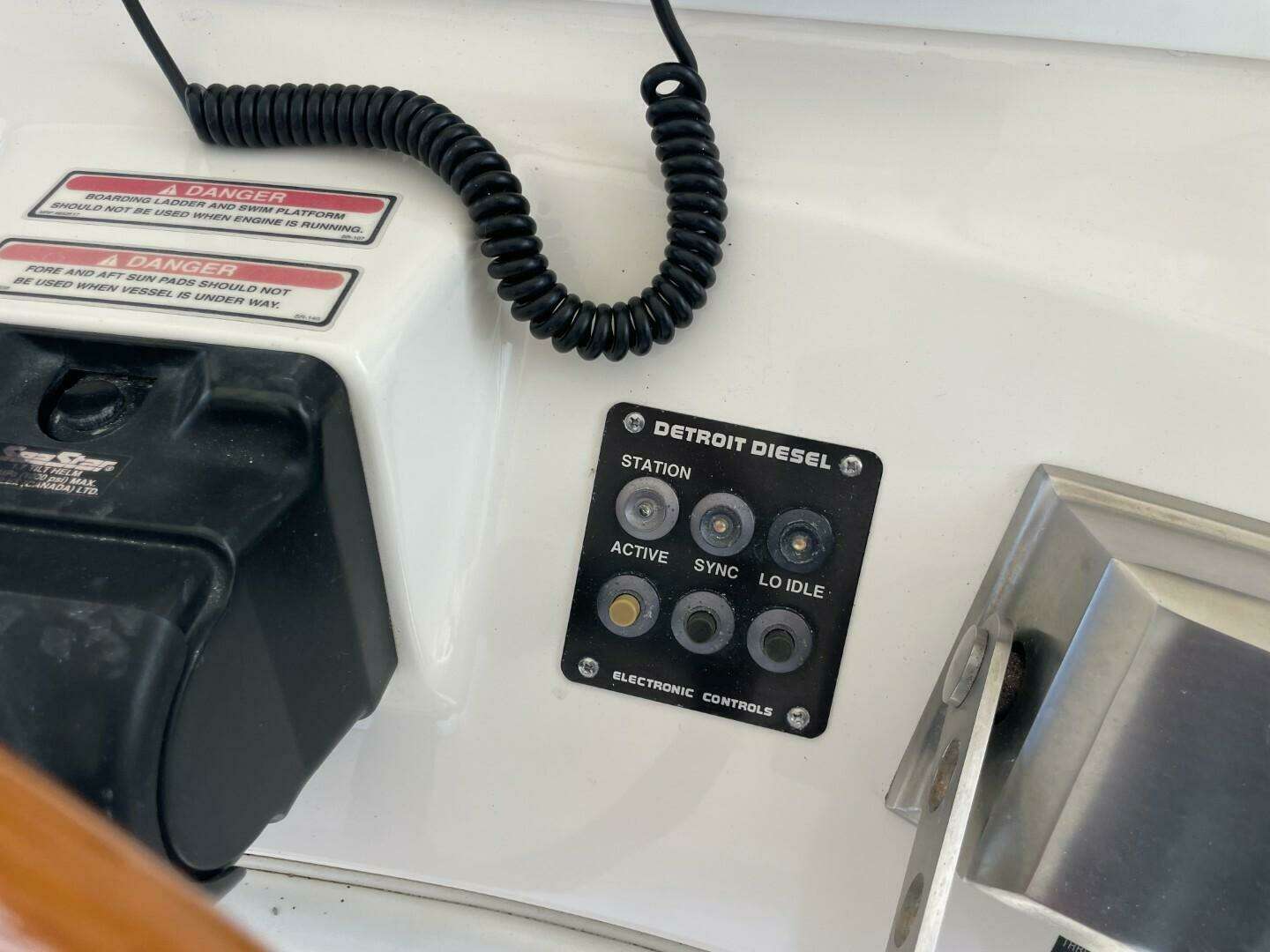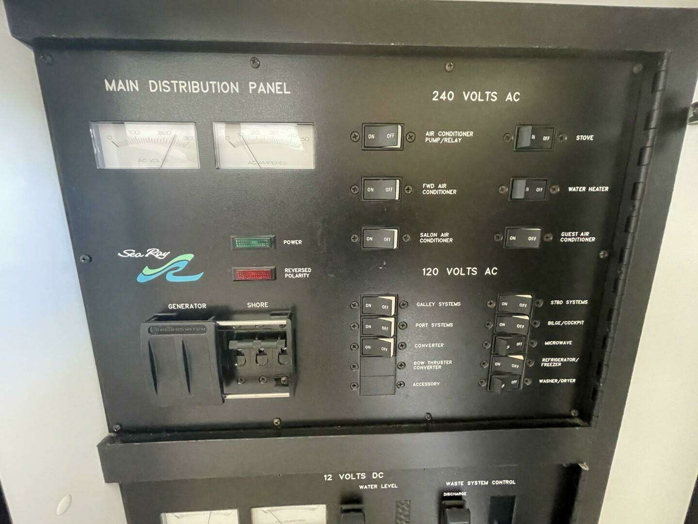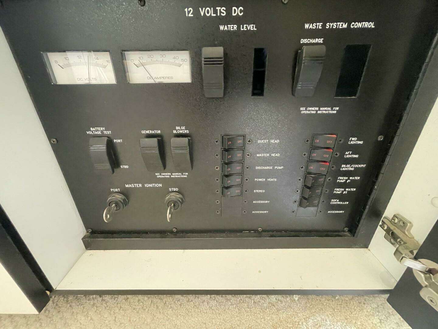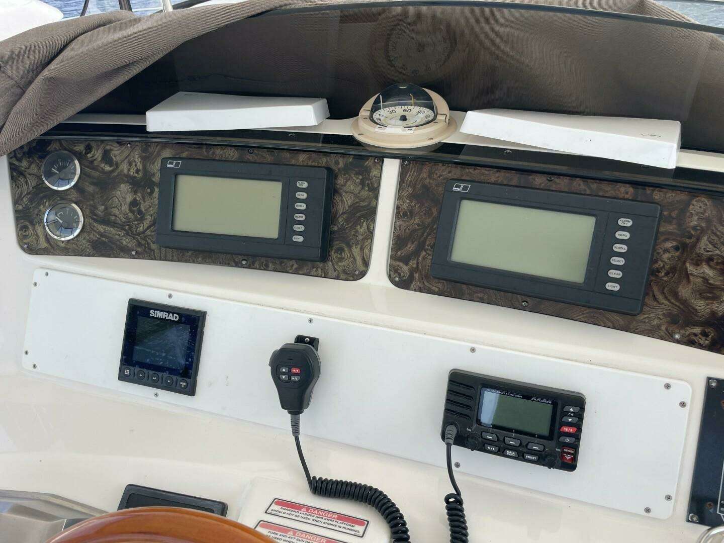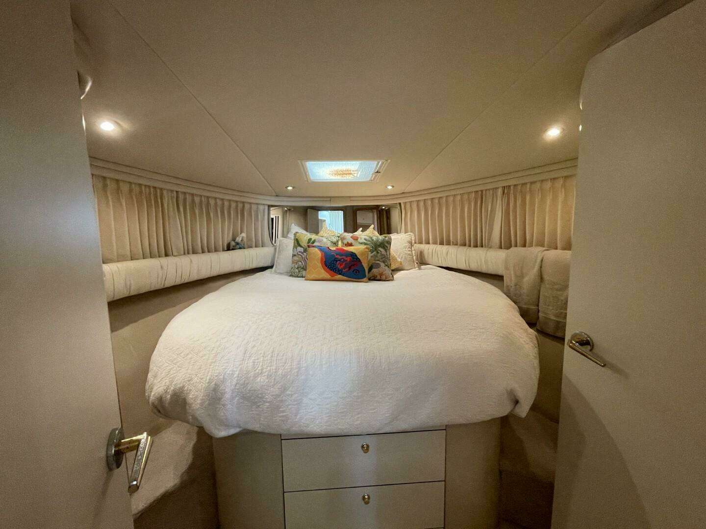 Starting as you board her from the large Swim Platform, you enter her cockpit which has been enclosed to make a great outdoor sitting area. She has a large storage hatch in the transom along with a bench seat. Her engine access is through a large hatch in the cockpit sole. Her cockpit, stairway to the bridge and bridge deck is on the port side. The stairway to the bridge is wide and easy to navigate. Her bridge is large and has her helm station with two swivel seats, a wet bar and l-shaped lounge forward, all kept comfortable by the reverse cycle heat and air. From the cockpit you enter her cabin via a sliding glass door and the first area is the salon, dinette and galley area. She has a settee along the port side that is electronically converted into a berth with the dinette forward. Her starboard side has an occasional chair and entertainment center, a country kitchen bar and galley forward. You move down the companionway steps and her guest cabin is to starboard and features an upper and lower berth that converts to a settee and is home to her washer/dryer. Her VIP Stateroom is to port and features a queen berth and entrance to the Guest Head (it also has an entrance from the companionway). All the way forward is her Master Stateroom which has an Island Queen Berth, Storage and entrance to the Master Head which is very impressive.