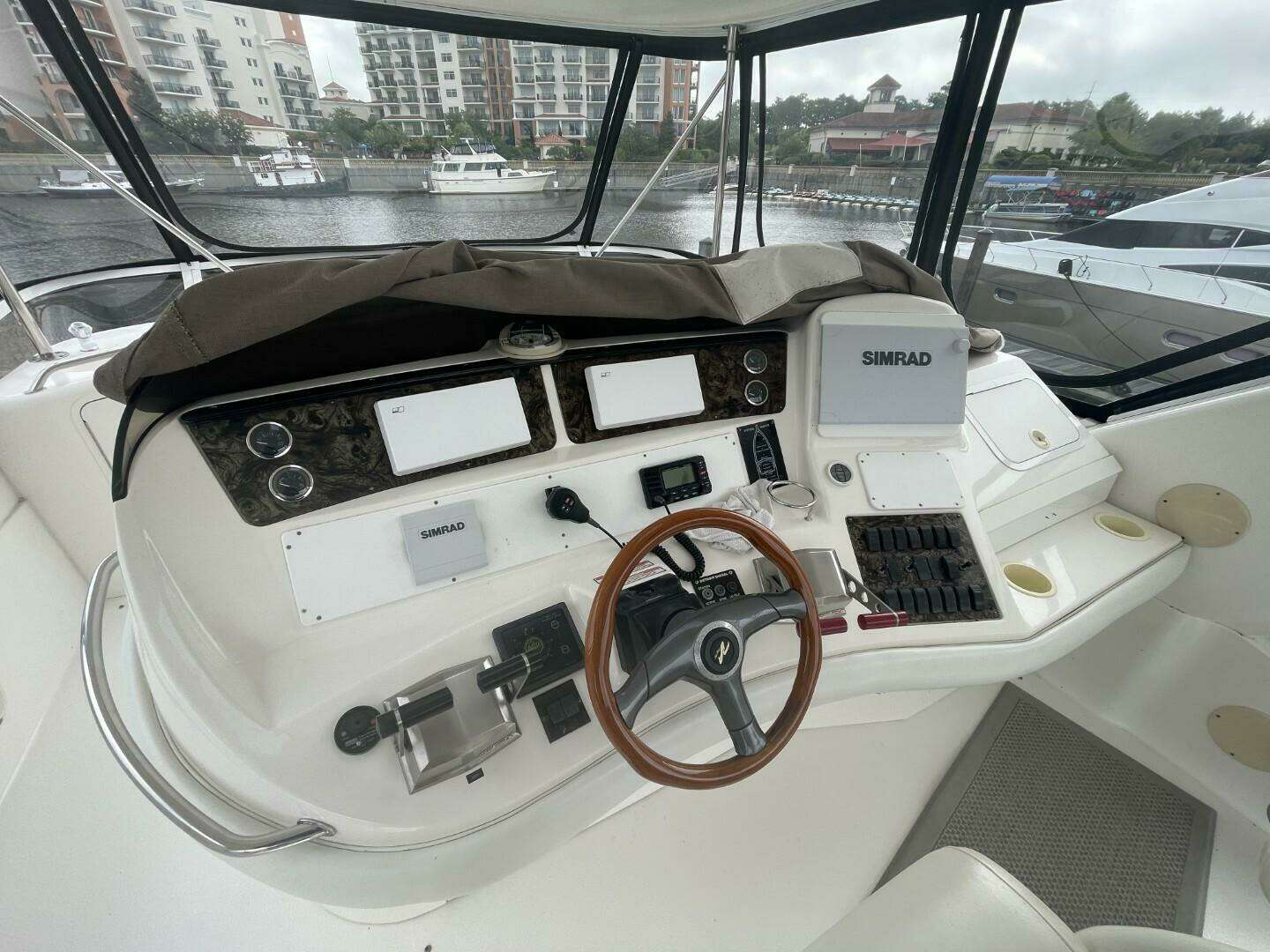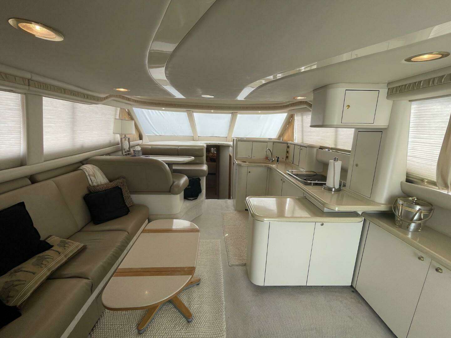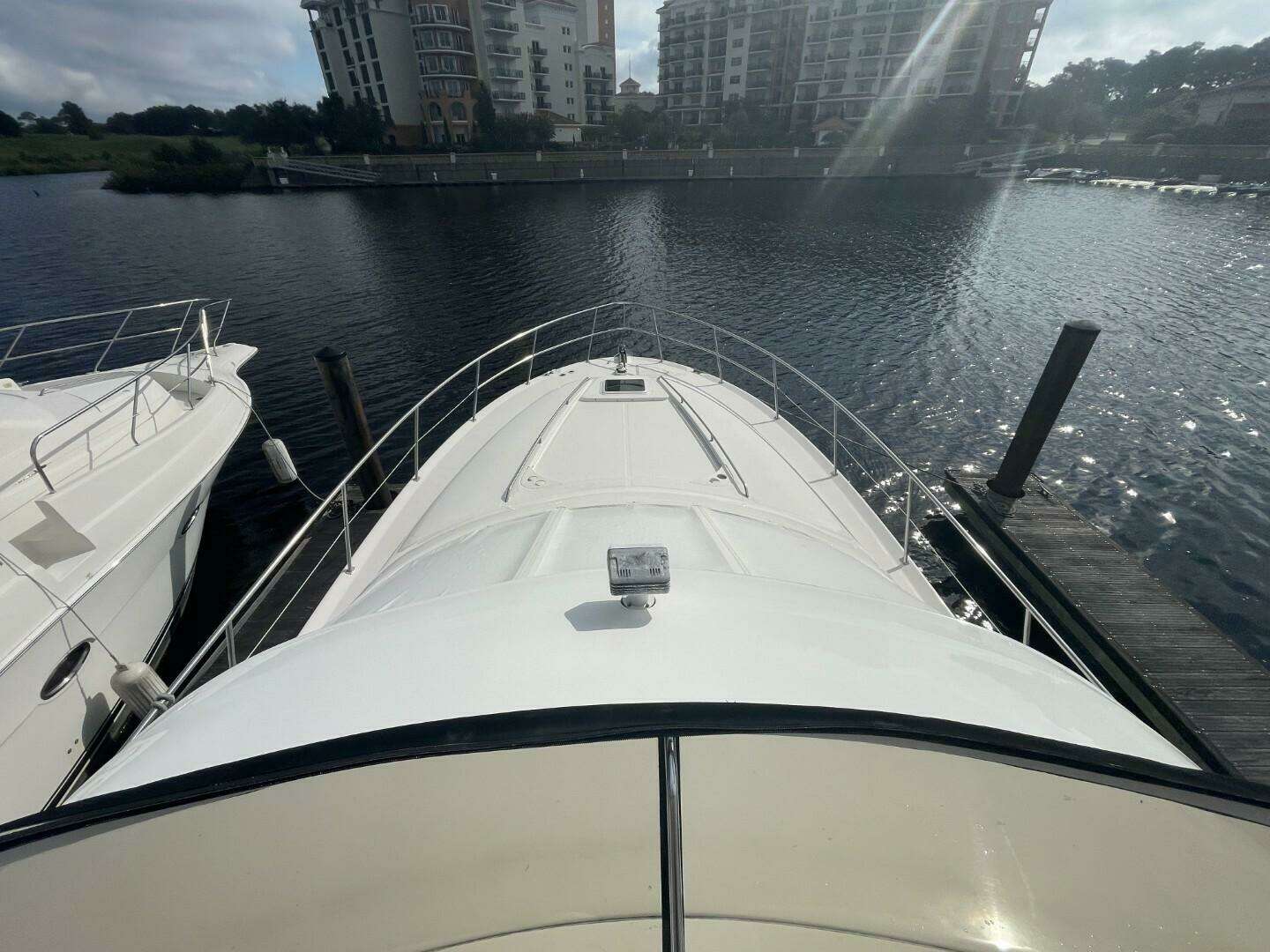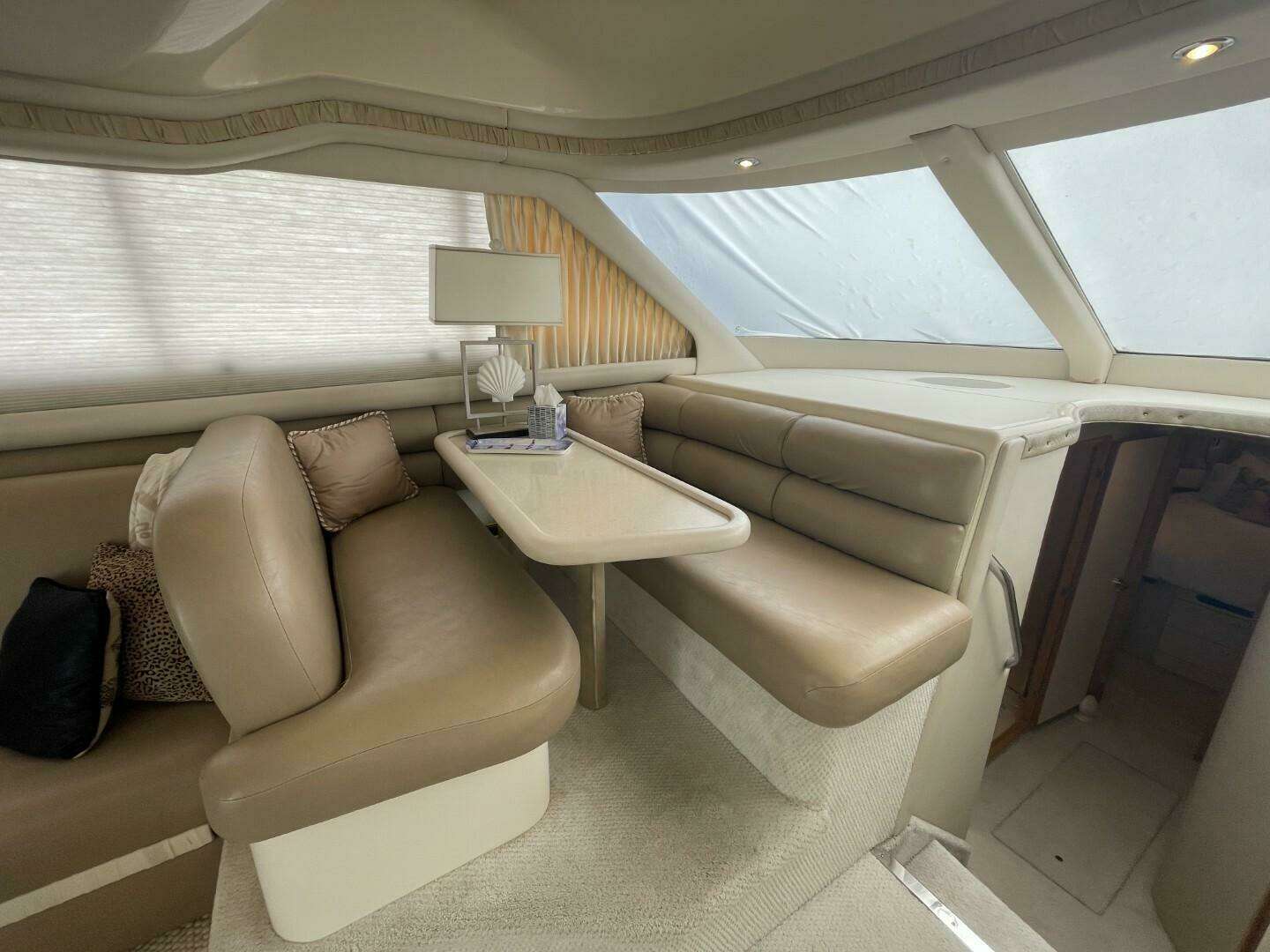 Starting as you board her from the large Swim Platform, you enter her cockpit which has been enclosed to make a great outdoor sitting area. She has a large storage hatch in the transom along with a bench seat. Her engine access is through a large hatch in the cockpit sole. Her cockpit, stairway to the bridge and bridge deck is on the port side. The stairway to the bridge is wide and easy to navigate. Her bridge is large and has her helm station with two swivel seats, a wet bar and l-shaped lounge forward, all kept comfortable by the reverse cycle heat and air. From the cockpit you enter her cabin via a sliding glass door and the first area is the salon, dinette and galley area. She has a settee along the port side that is electronically converted into a berth with the dinette forward. Her starboard side has an occasional chair and entertainment center, a country kitchen bar and galley forward. You move down the companionway steps and her guest cabin is to starboard and features an upper and lower berth that converts to a settee and is home to her washer/dryer. Her VIP Stateroom is to port and features a queen berth and entrance to the Guest Head (it also has an entrance from the companionway). All the way forward is her Master Stateroom which has an Island Queen Berth, Storage and entrance to the Master Head which is very impressive.