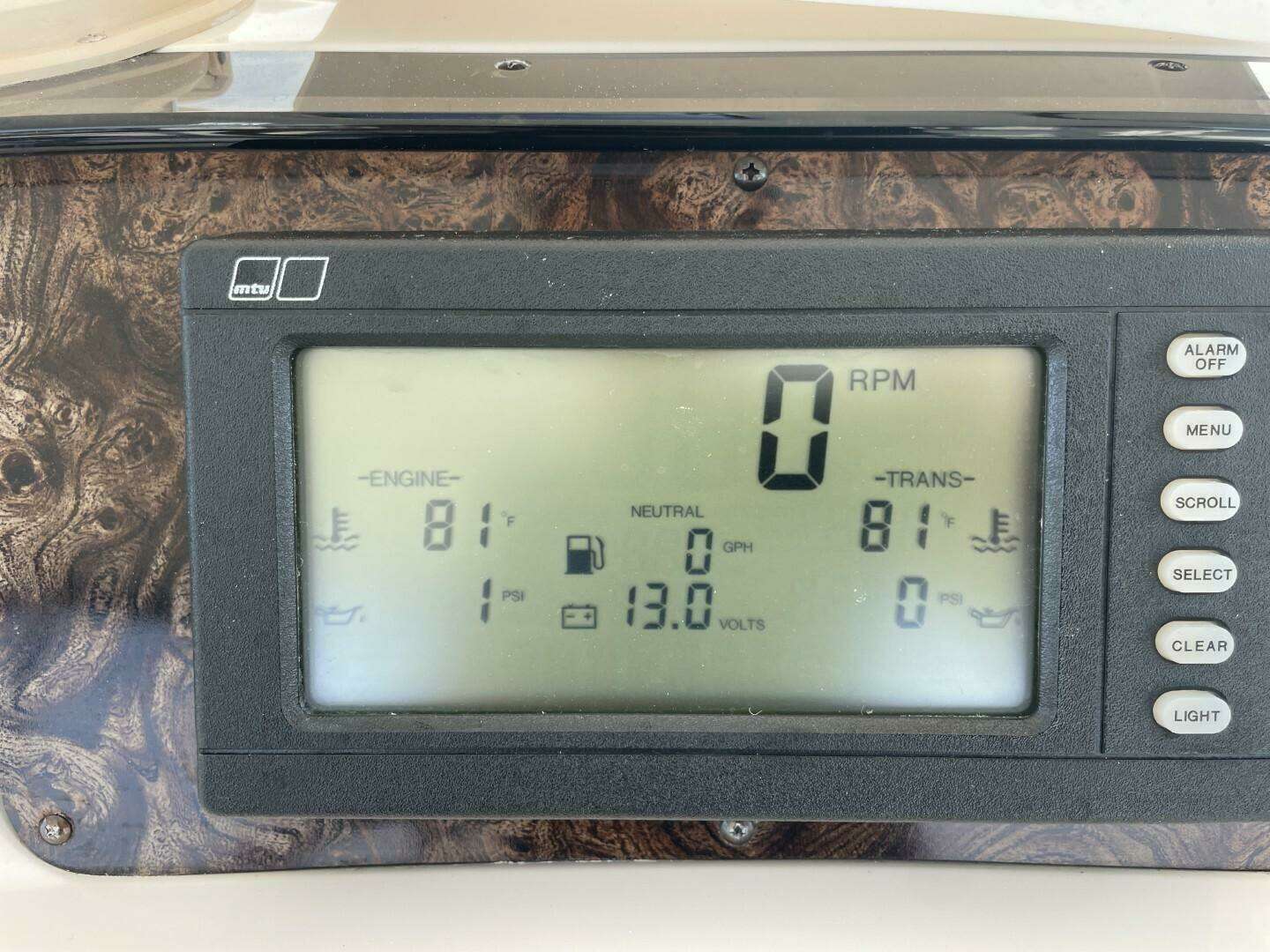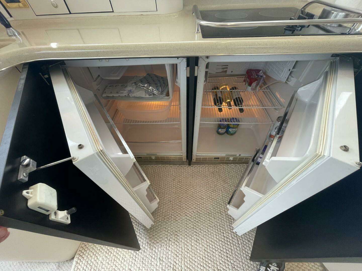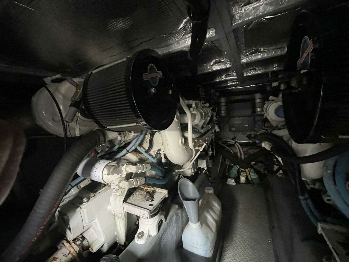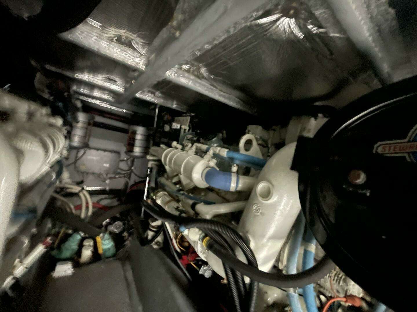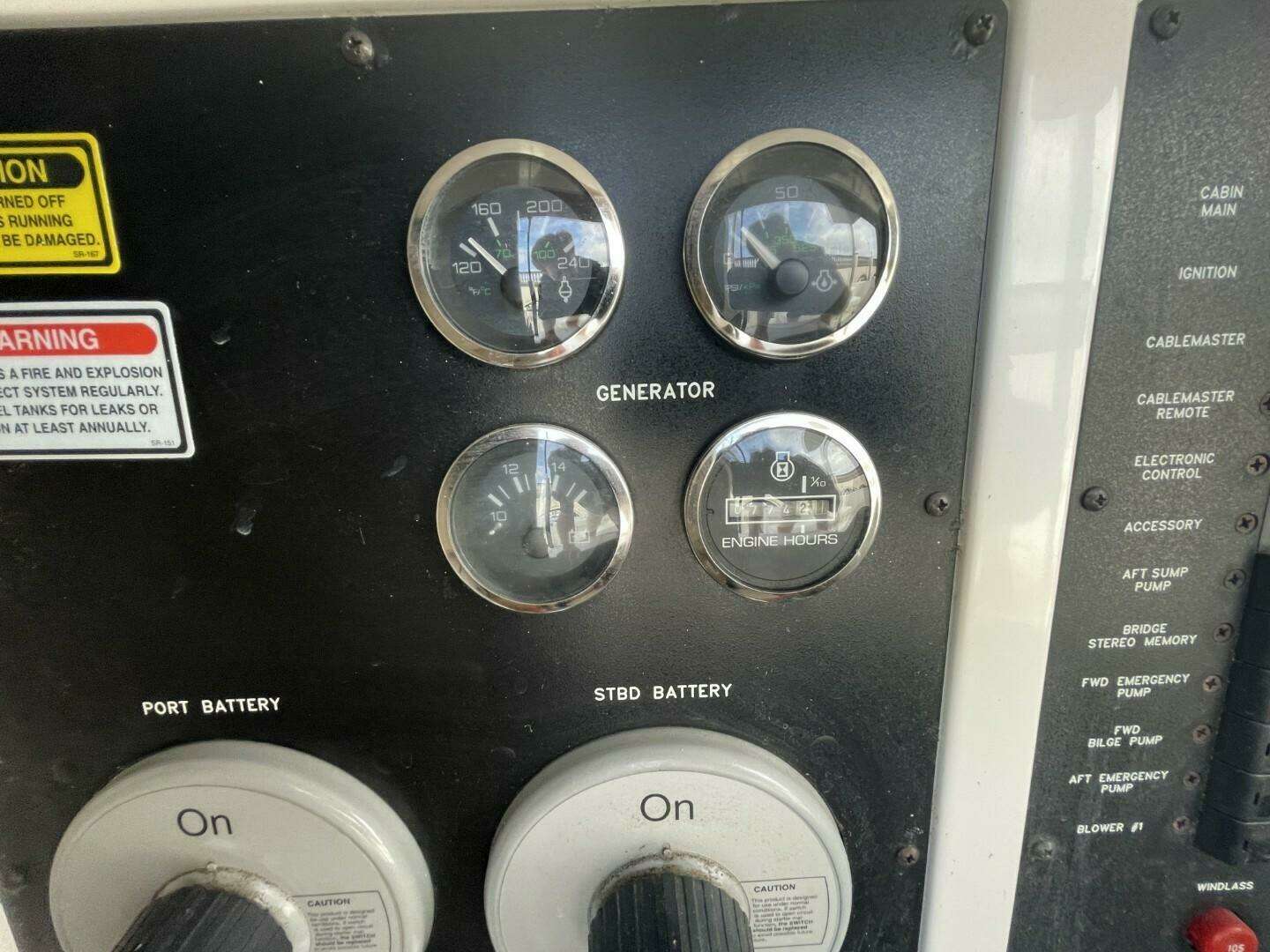 Starting as you board her from the large Swim Platform, you enter her cockpit which has been enclosed to make a great outdoor sitting area. She has a large storage hatch in the transom along with a bench seat. Her engine access is through a large hatch in the cockpit sole. Her cockpit, stairway to the bridge and bridge deck is on the port side. The stairway to the bridge is wide and easy to navigate. Her bridge is large and has her helm station with two swivel seats, a wet bar and l-shaped lounge forward, all kept comfortable by the reverse cycle heat and air. From the cockpit you enter her cabin via a sliding glass door and the first area is the salon, dinette and galley area. She has a settee along the port side that is electronically converted into a berth with the dinette forward. Her starboard side has an occasional chair and entertainment center, a country kitchen bar and galley forward. You move down the companionway steps and her guest cabin is to starboard and features an upper and lower berth that converts to a settee and is home to her washer/dryer. Her VIP Stateroom is to port and features a queen berth and entrance to the Guest Head (it also has an entrance from the companionway). All the way forward is her Master Stateroom which has an Island Queen Berth, Storage and entrance to the Master Head which is very impressive.