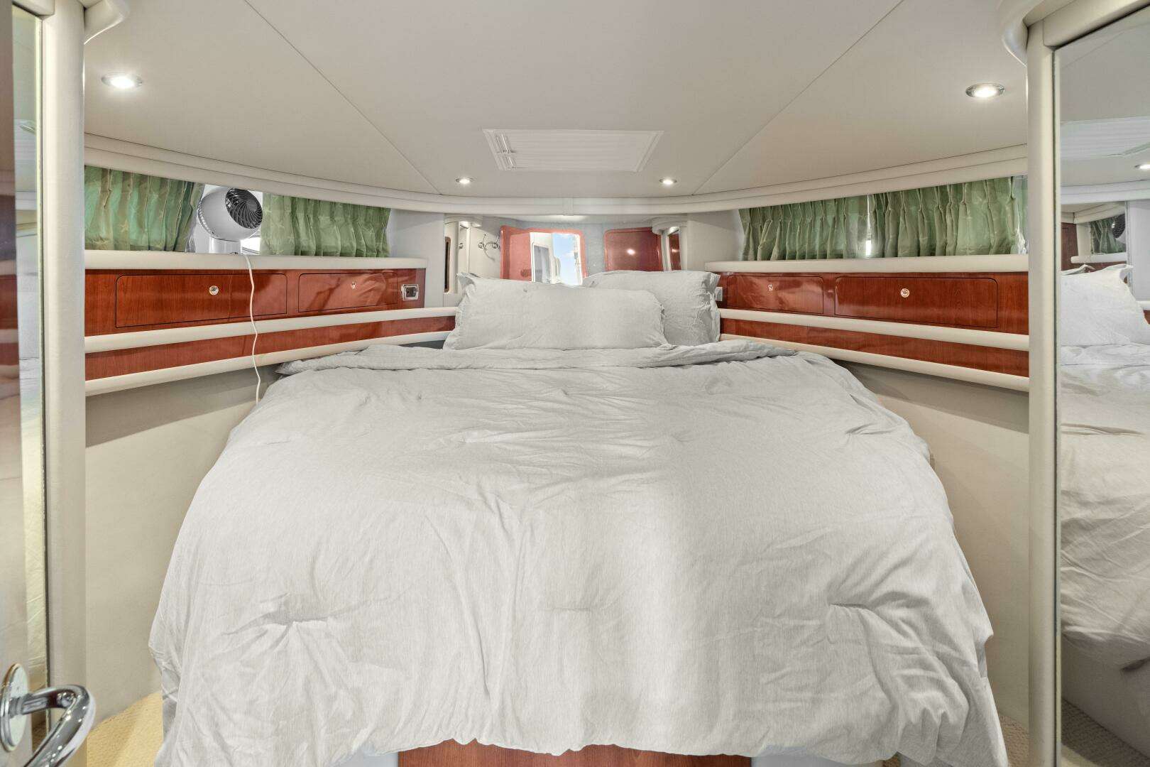 Master Stateroom Center Queen Berth forward w/ Private Head w/ Sealand Vacu-flush Toilet, Vanity, Sink & Separate Shower Stall