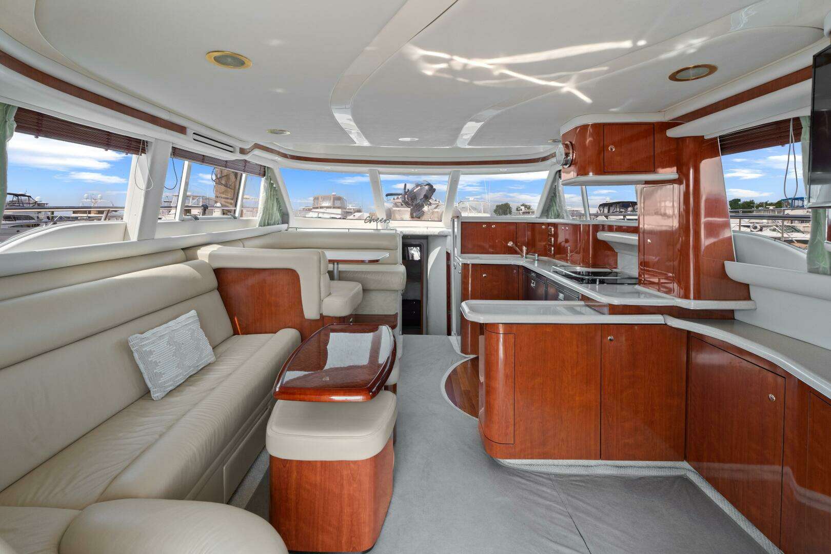 The Flybridge includes a wet-bar sink and Isotherm Refrigerator/Freezer and has a designated reverse cycle Air & Heat