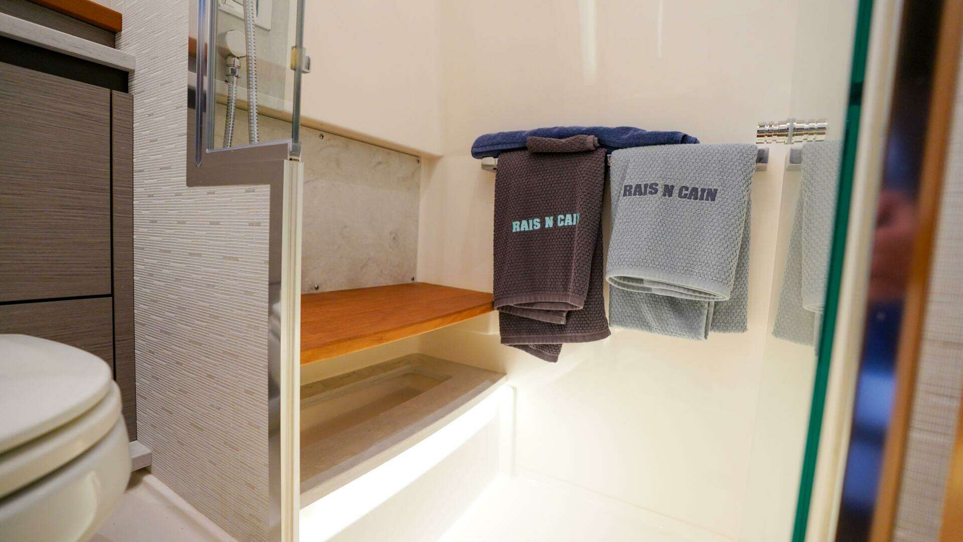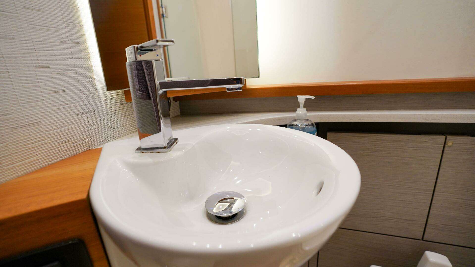 - Aft centerline teak accents on bulkhead and overhead