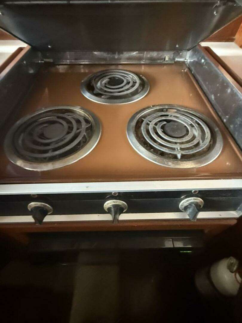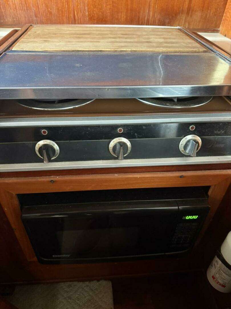 The galley is fully equipped for extended cruising, featuring a Haier refrigerator, 3-burner electric stove, microwave, double stainless sink, and an 11-gallon water heater. Counter space and cabinetry provide both function and storage for extended stays aboard.