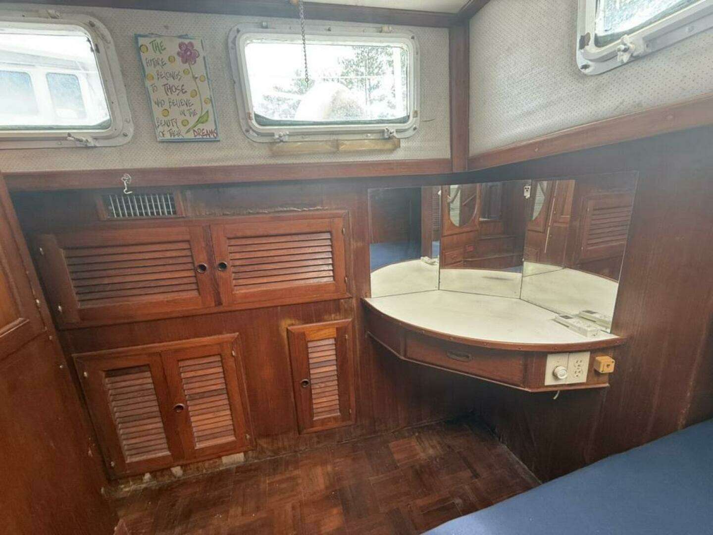 Inside, her classic teak parquet floors and Corinthian marble sinks in both heads highlight her original craftsmanship.