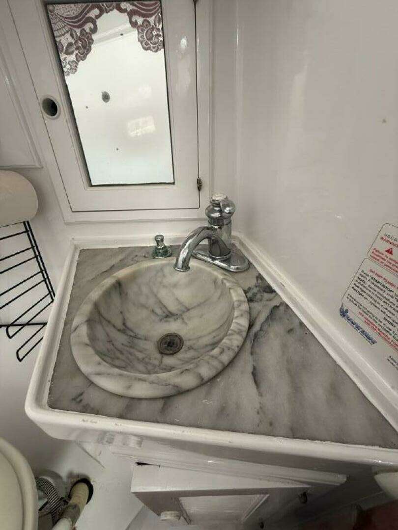 - Forward Stateroom: A V-berth cabin with ample storage and private access to an ensuite head, complete with a white Carrara marble sink, separate shower, and bathtub—a rare luxury on a trawler of this size.