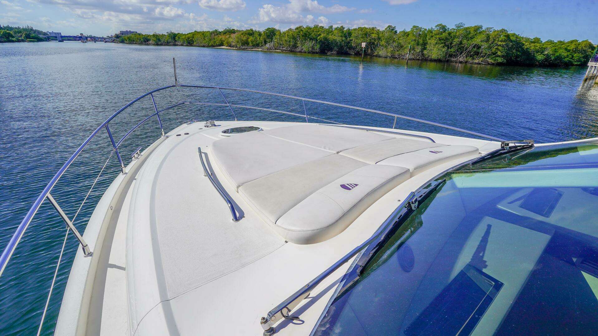 Returning topside, wide molded steps lead to the flybridge, one of the Phantom 48’s standout features. Here you’ll find expansive U-shaped seating with a convertible dining/sunpad area, an outdoor wet bar with grill, refrigerator, and sink, and a fully equipped upper helm station offering excellent sightlines. Completing the experience, the foredeck sunpads offer a quiet place to relax underway or at anchor, perfectly illustrating why the 2009 Fairline Phantom 48 continues to be one of the most sought-after luxury flybridge yachts in the 50-foot class.