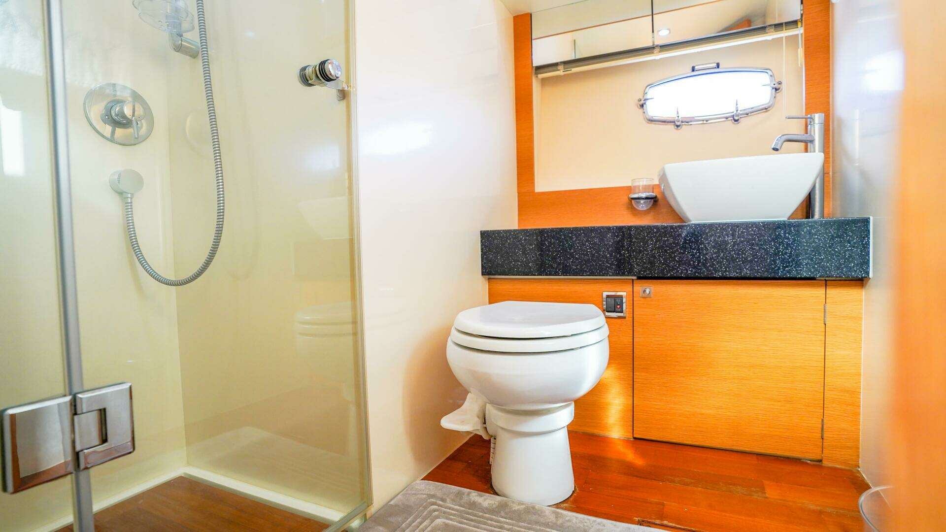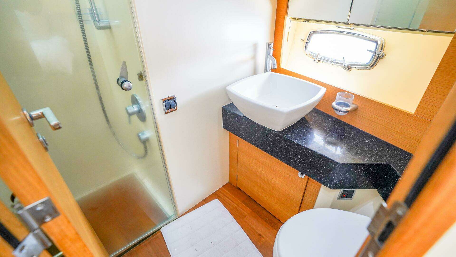 Forward, the VIP stateroom offers a generous double berth, ample lockers, opening portholes, and direct access to the day head, which also serves the starboard guest cabin. The guest cabin features full-length upper and lower Pullman berths, making it ideal for children or additional guests, while maintaining excellent headroom and storage. The day head includes a separate shower stall, silent-flush toilet, and quality fixtures, reflecting Fairline’s attention to detail throughout.