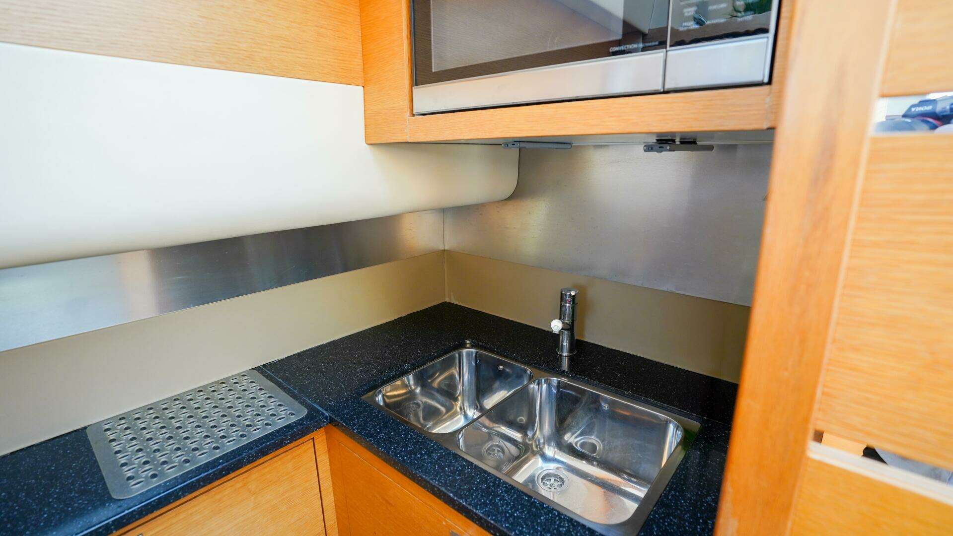 Moving forward, the galley is thoughtfully arranged for liveaboard comfort and functionality, featuring an electric ceramic hob, microwave oven and grill, full refrigerator with icebox, built-in floor freezer, integrated waste bin, and generous work surfaces with task lighting. Flexi-teak flooring and excellent storage ensure the galley performs as well underway as it does dockside, making it ideal for longer passages or family cruising.
