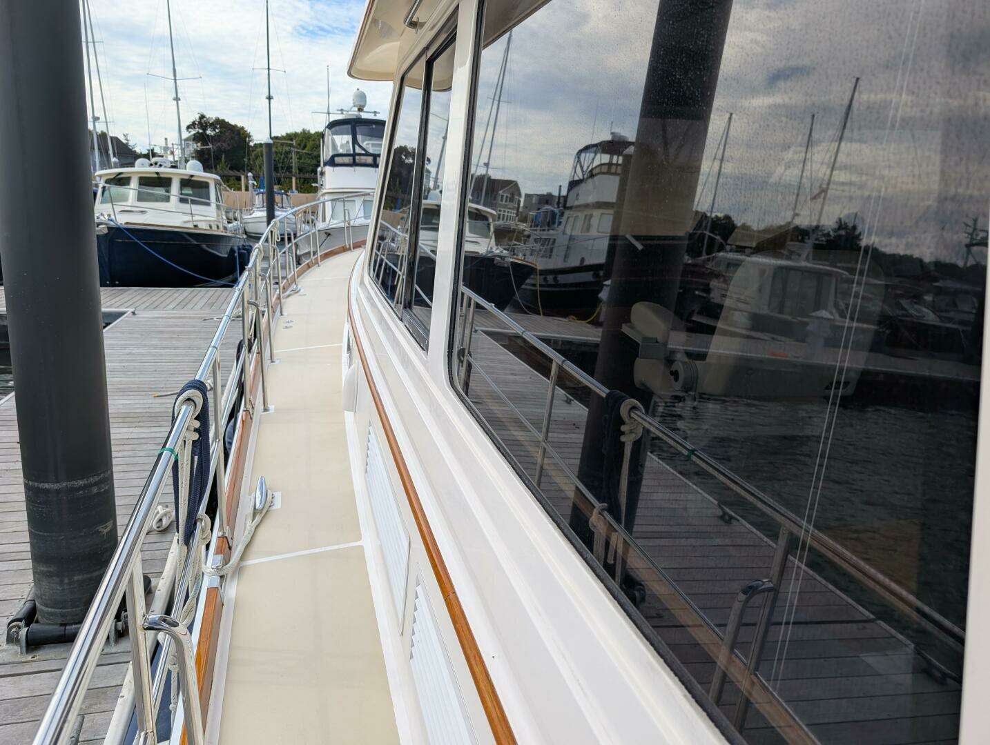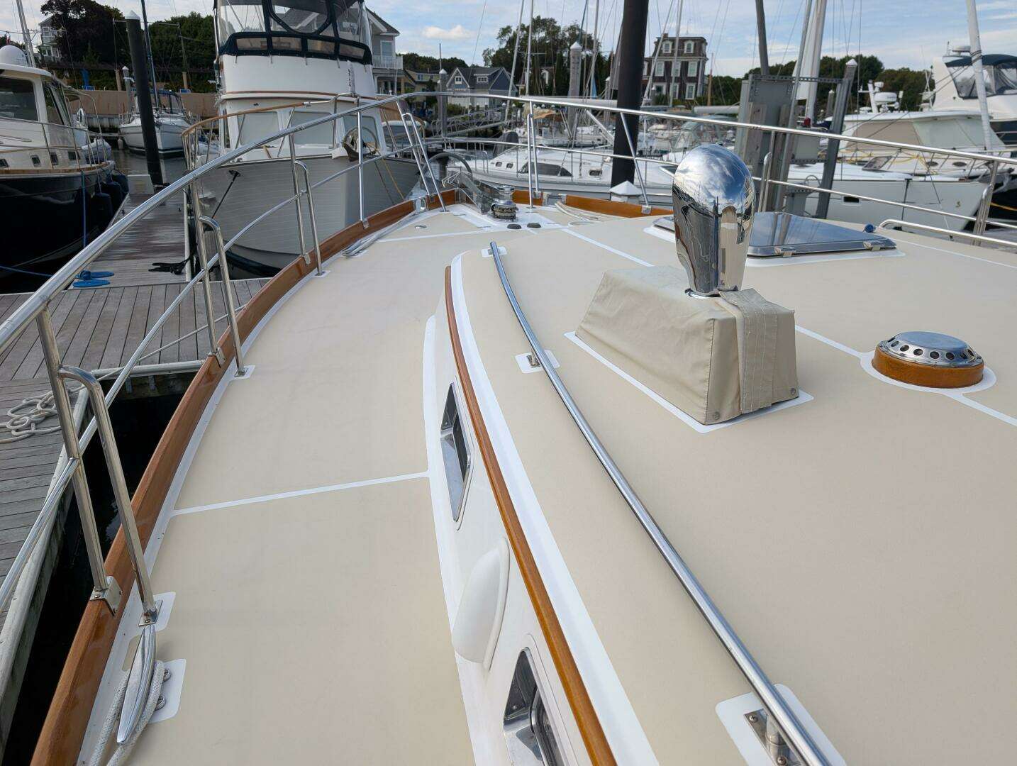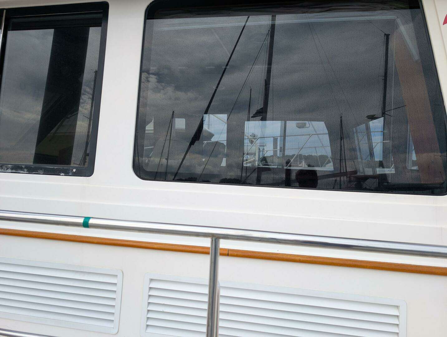 Teak Toe rail, hand rails, eyebrow, aft window frames, pilothouse doors (2) varnished