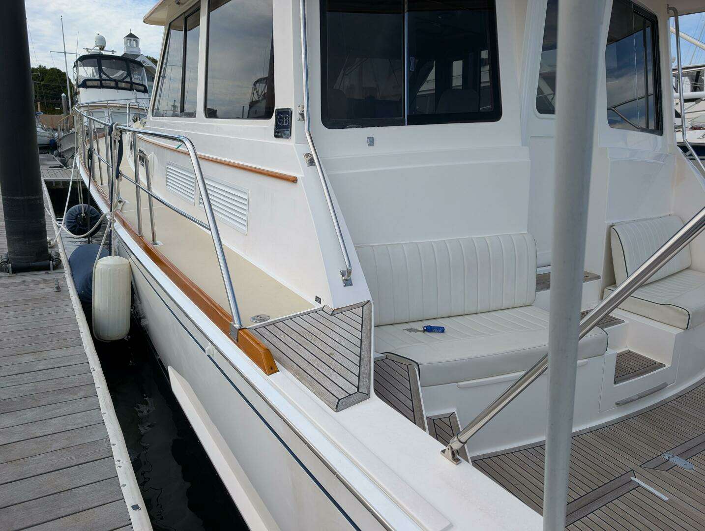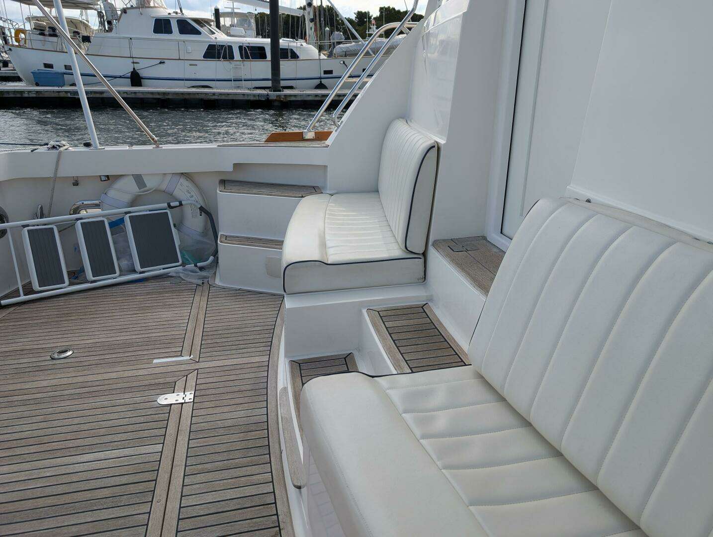 The cockpit is quite large and is a perfect place for entertaining or enjoying the fresh air while underway. She has a beautiful teak sole with three (3) large lazarette hatches, molded steps leading to the side decks, easy access through the transom door from the swim platform, and more: