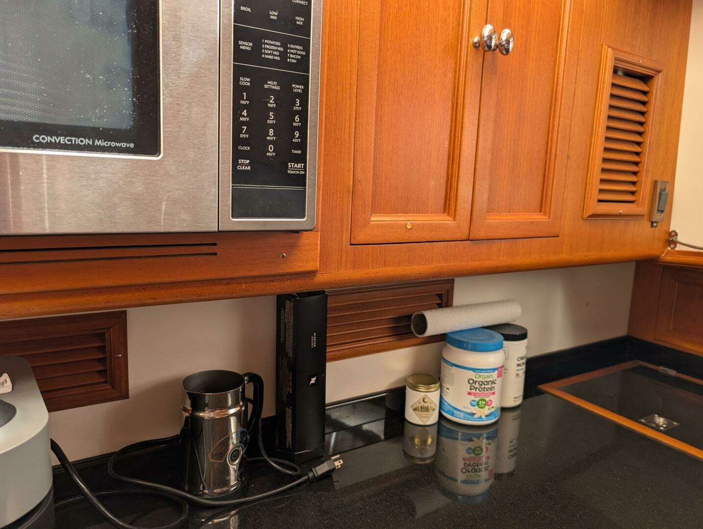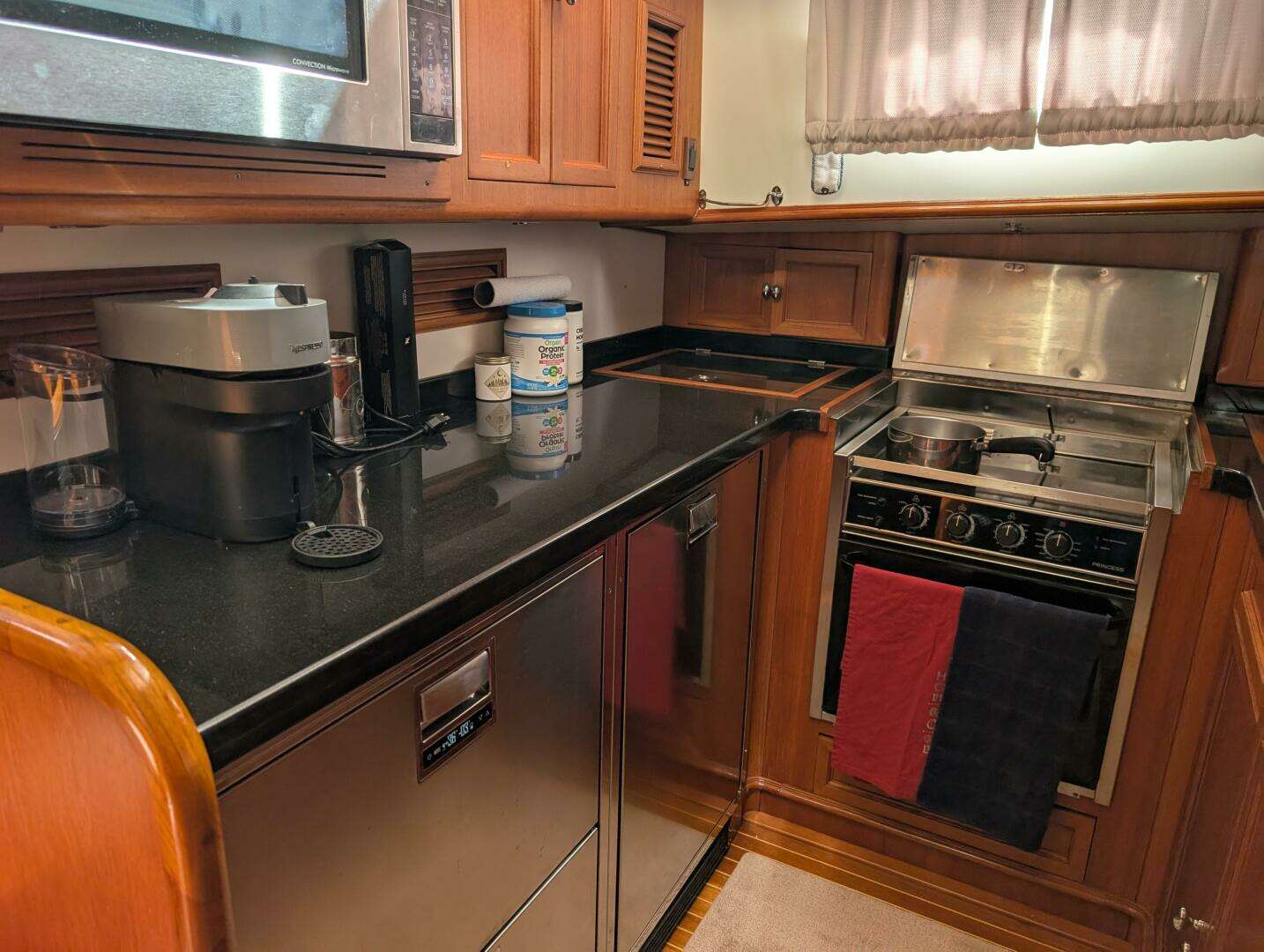 - Galley and Dinette: Located below deck, the galley includes Sub-Zero refrigeration, Corian countertops, and often a dinette or workspace opposite, equipped with modern appliances