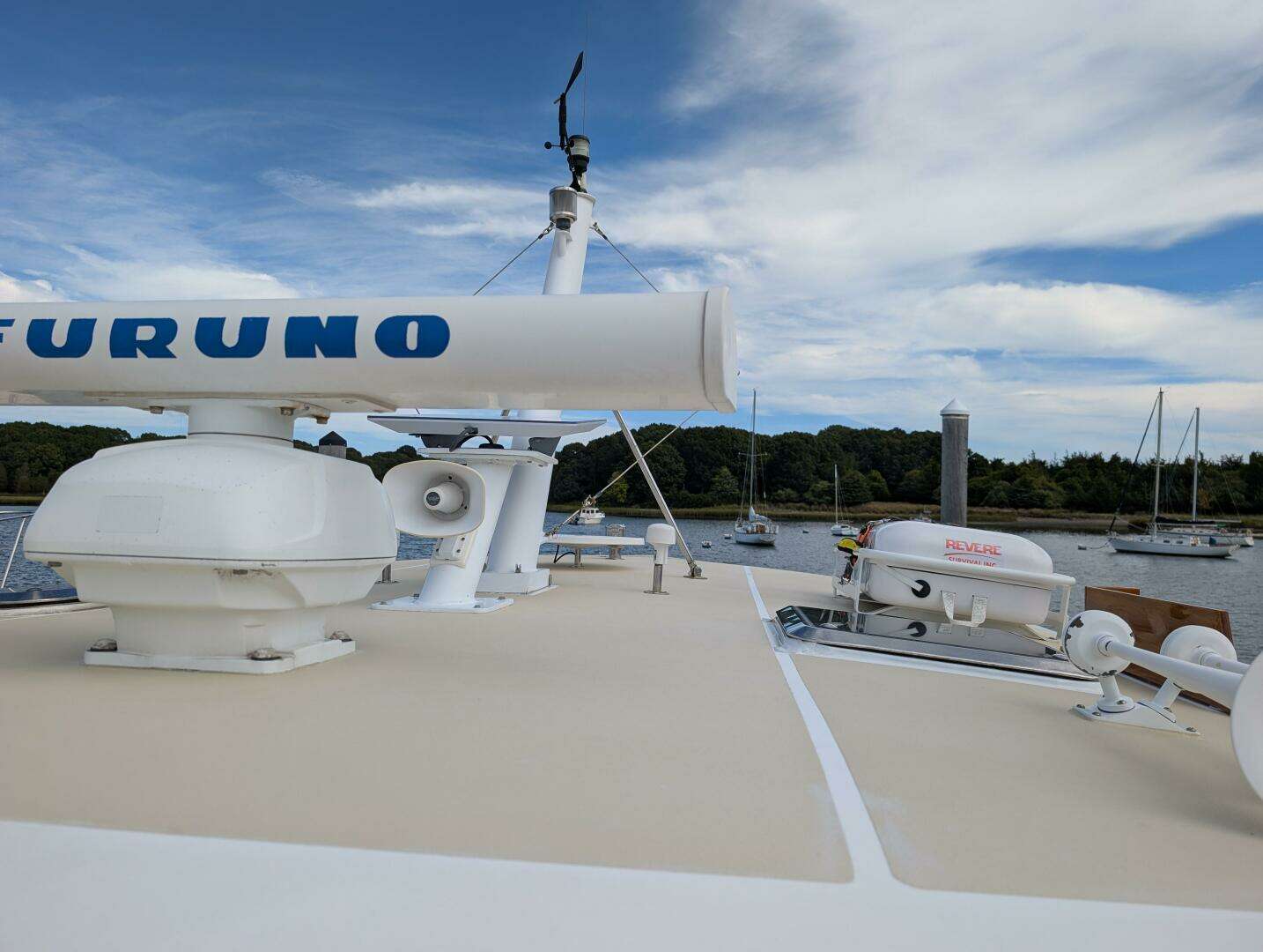 Custom cockpit bimini- intended for use while underway. Dingy davit system with swim platform chocks (removable- not currently installed)