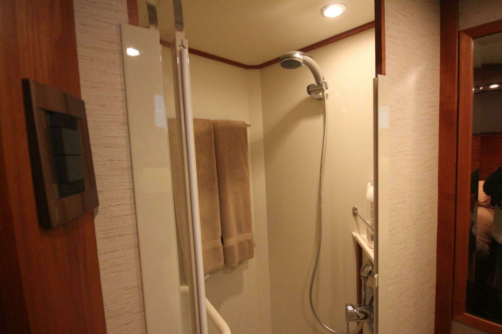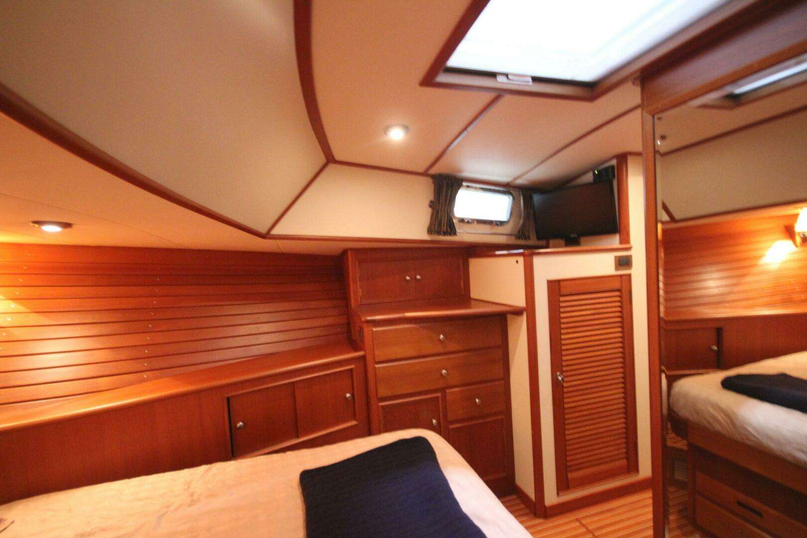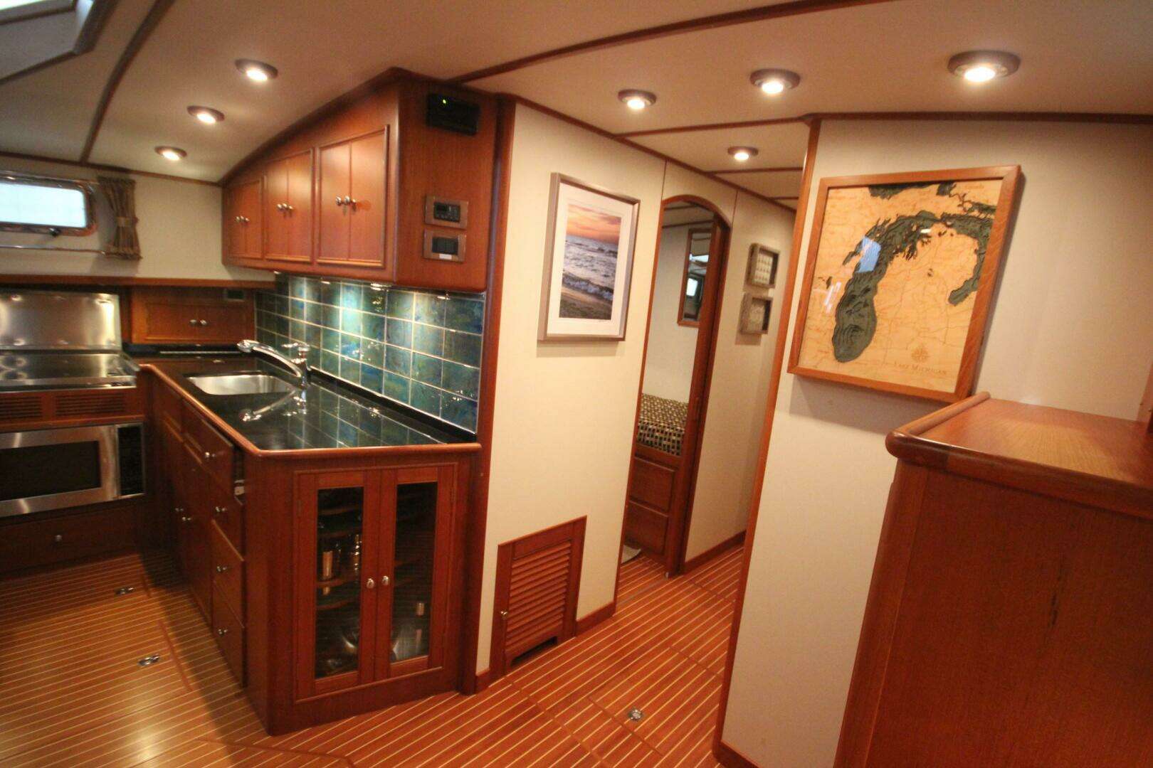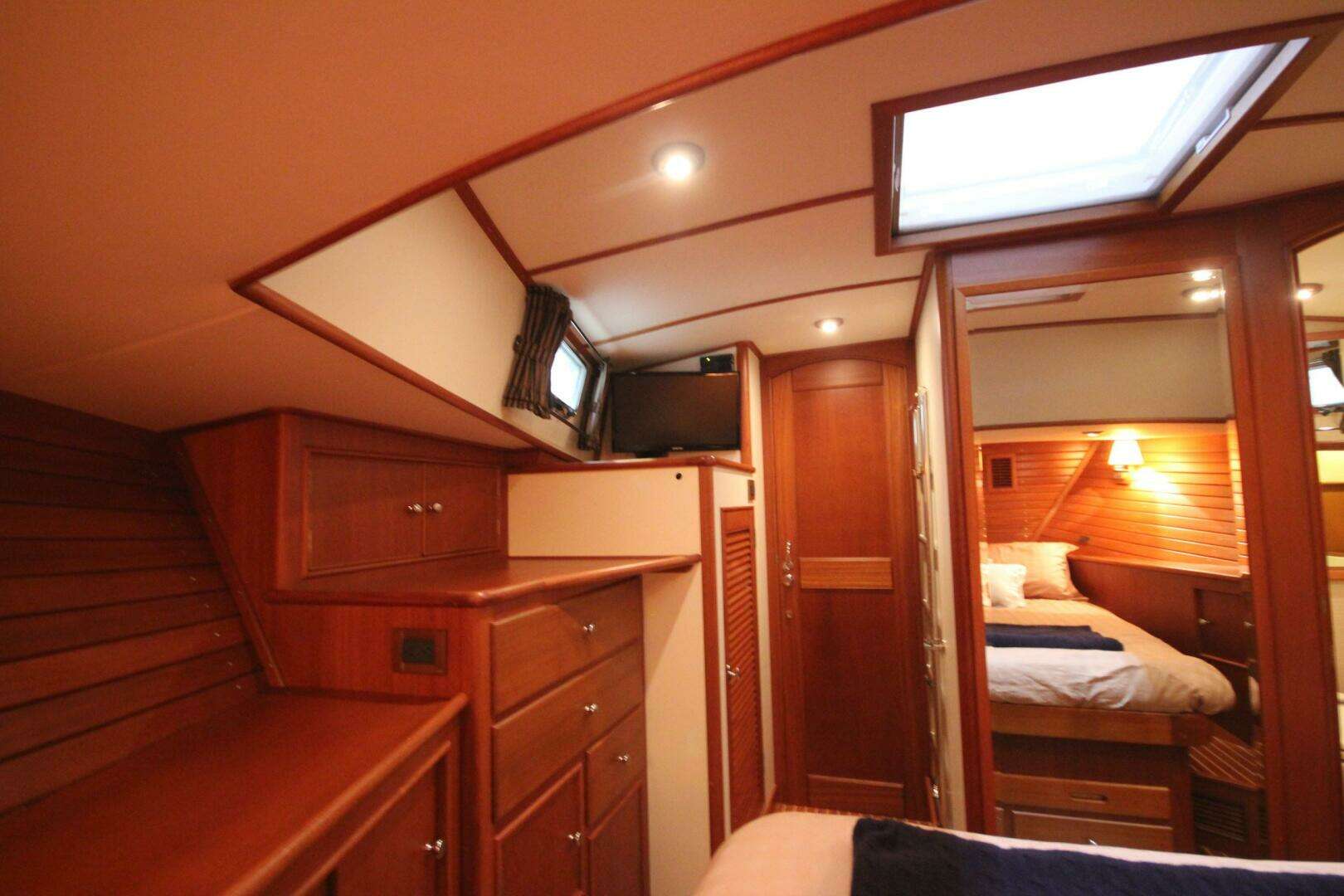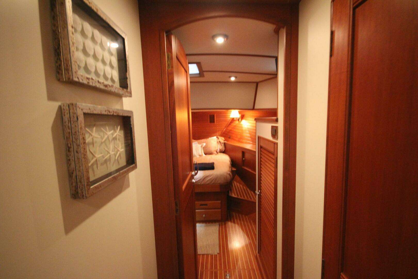 She has a two stateroom, two head layout with the office located on the starboard side opposite the galley. The washer / dryer is located in the office locker.