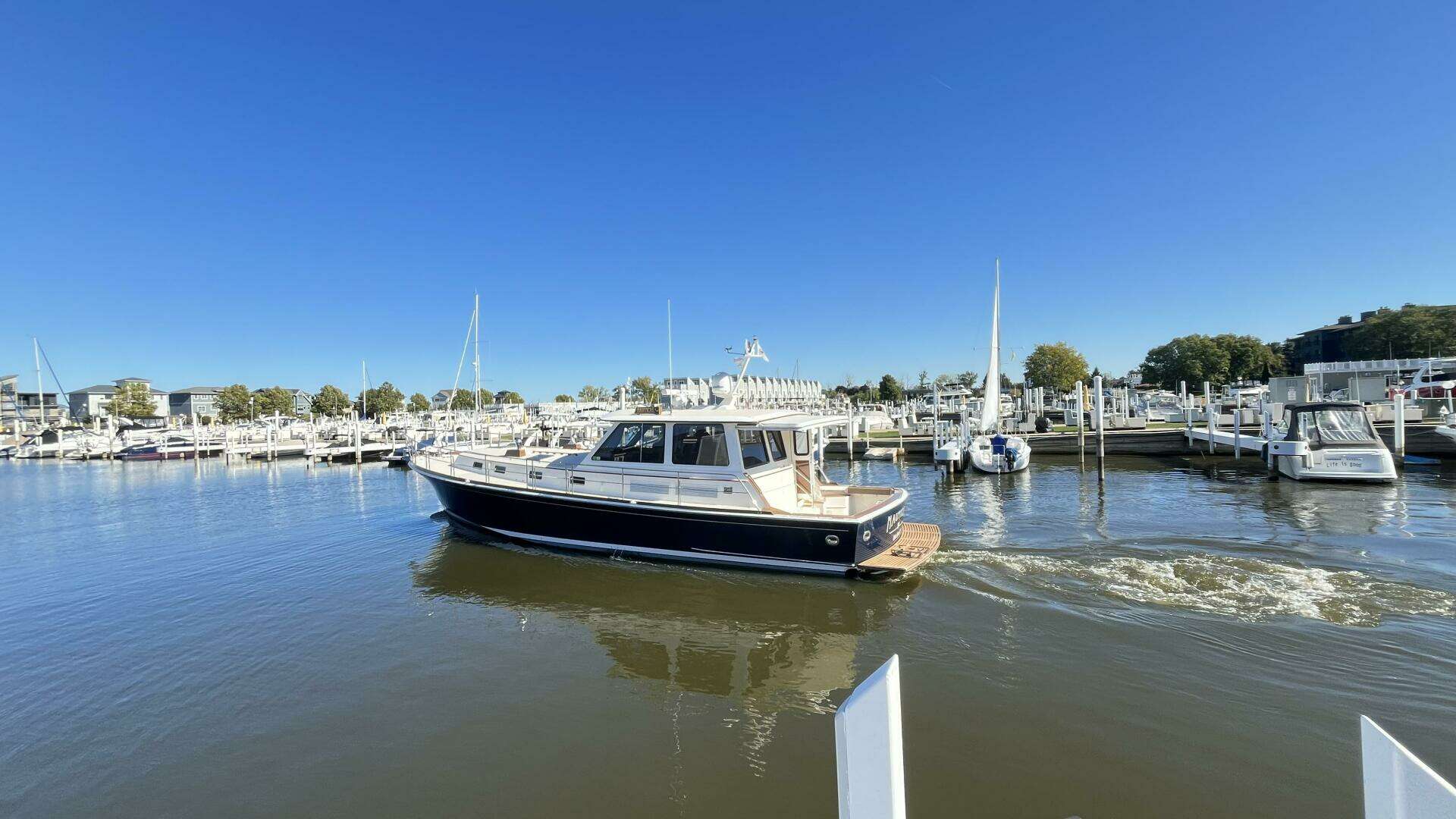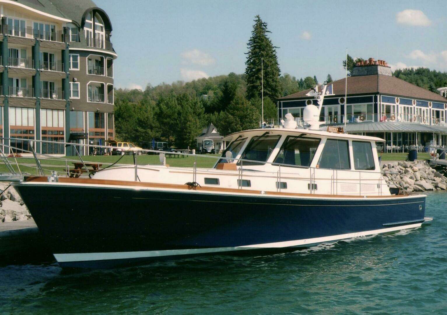 She is loaded with customs and options which include; 3 Stidd Helm chairs, custom painted Awlgrip Navy Hull, Twin Disc Single Lever Controls, Salon Blinds, Electric Salon table, Washer/Dryer, Full newer (2020) Garmin Electronic Package including SAT TV, custom teak wood accents and a CUSTOM $17,350 Engine Room Sound Insulation package.