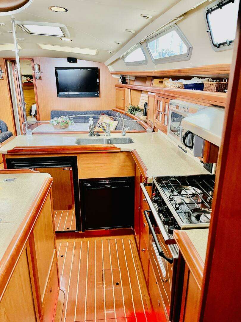 Below-decks you will find she has 6' 9" of headroom, abundant natural light, and the highest quality woodwork and a highly functional extremely spacious layout. With three private cabins, two heads and a separate shower, an enormous salon with a large flatscreen and Bose Surround Sound, and a fully equipped navigation station/office area. The galley is perfect with expansive counter space, a deep double sink, two refrigerators and two large freezers, microwave oven with built in coffee pot, and a stovetop hood with fan over 3-burner propane stove and oven. The master stateroom has a centerline queen, hanging lockers and drawers, and a large shower separate from the head. The aft cabin has a built-in washer/dryer. She would be a great place to work and liveaboard.