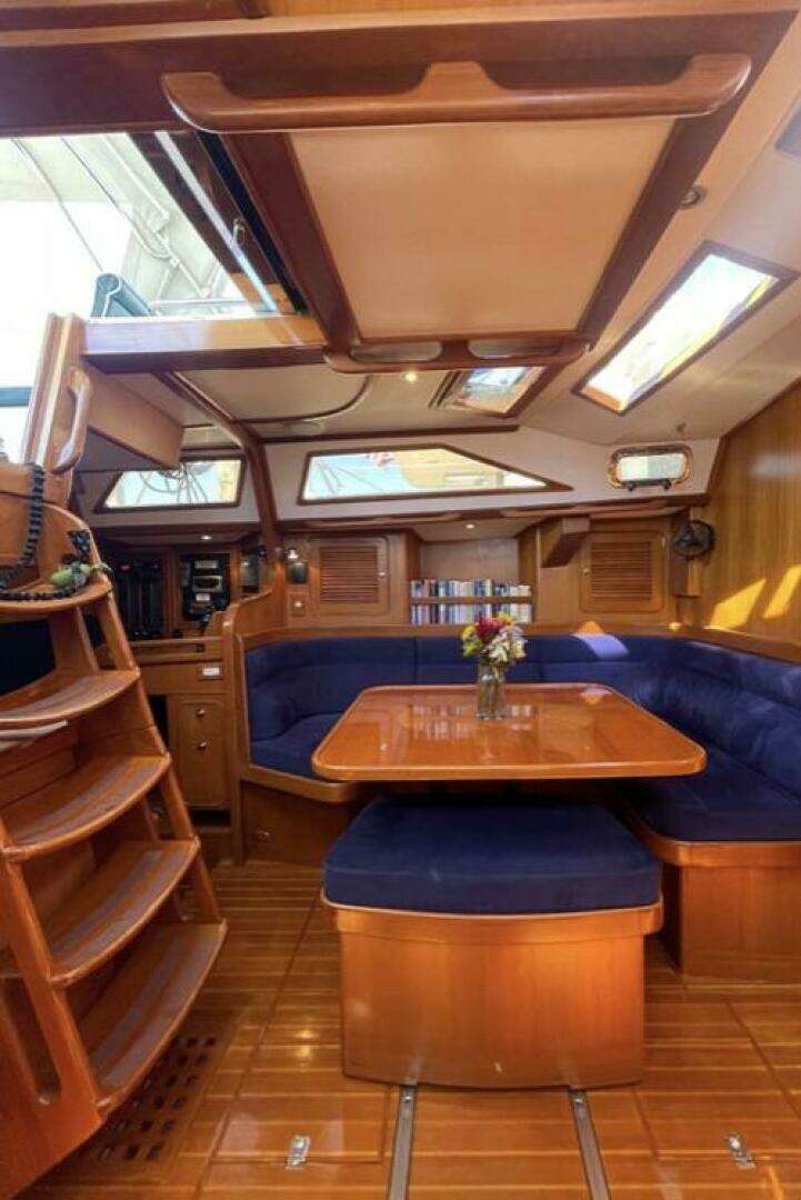 Below, the interior is a testament to craftsmanship and livability. Warm teak joinery and fine veneer work create an inviting, yacht-like environment. The spacious salon features deep settees, generous storage, and abundant natural light — perfect for long passages or relaxed evenings at anchor. The galley is well-appointed for serious provisioning and meal preparation, and the private cabins forward and aft provide comfortable retreats.