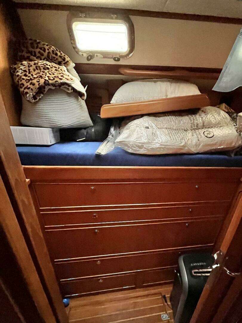 - Cabinets outboard of upper berth with louvered doors and a single removable shelf