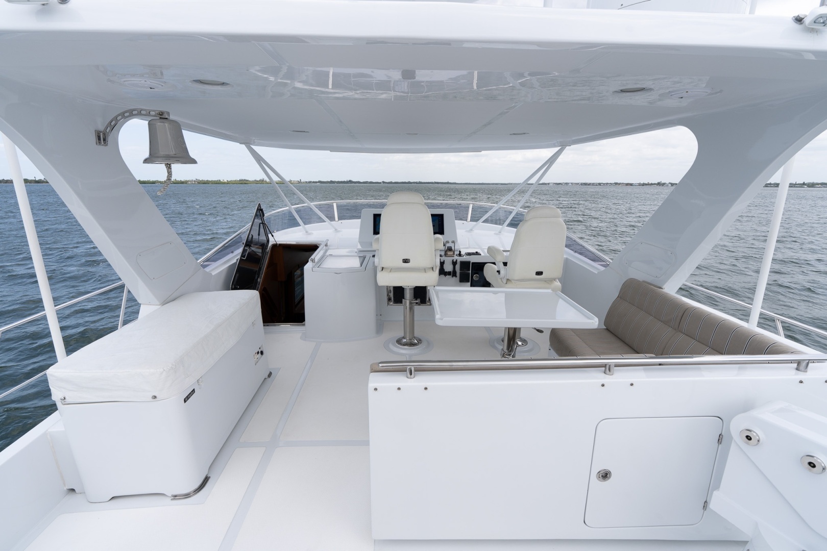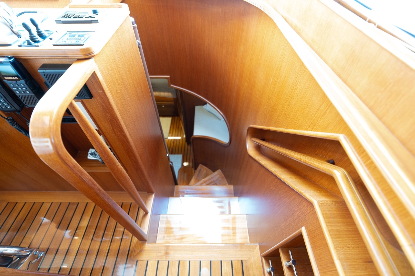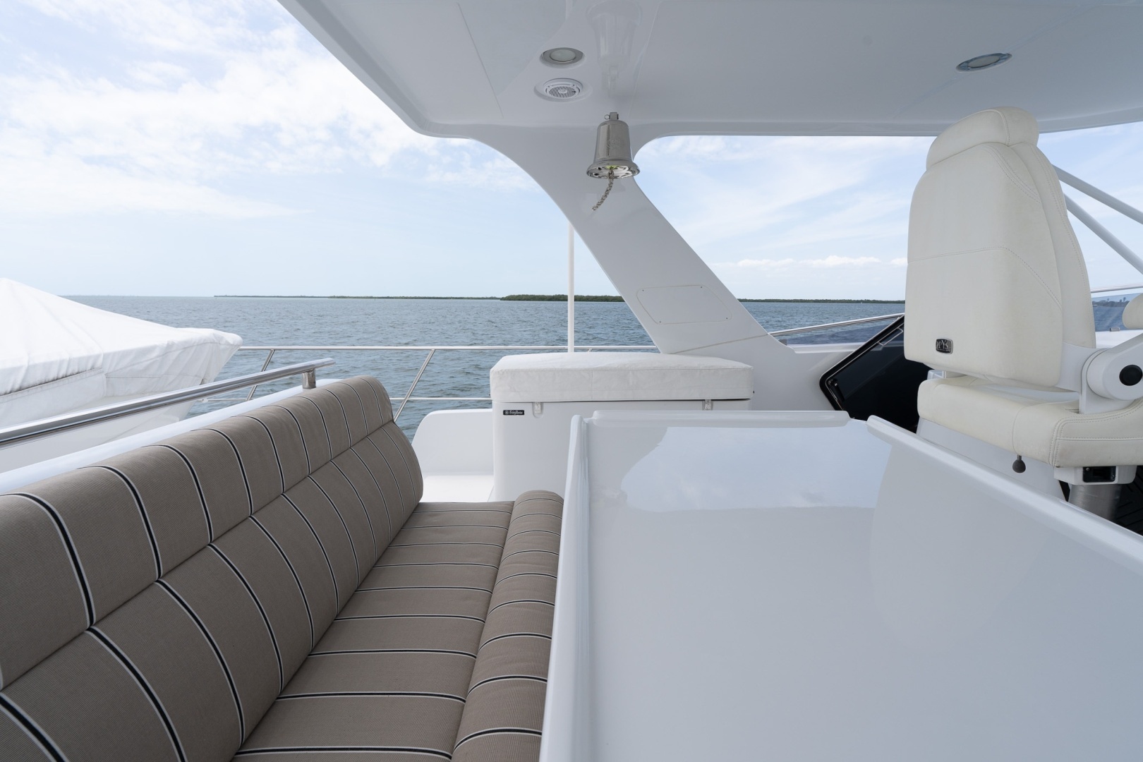 Thoughtfully designed for both functionality and comfort, the pilothouse offers port and starboard access doors, providing effortless movement throughout the vessel as well as refreshing cross-ventilation on pleasant days. At the helm, a custom-designed double-wide “love seat” invites shared moments while navigating.
