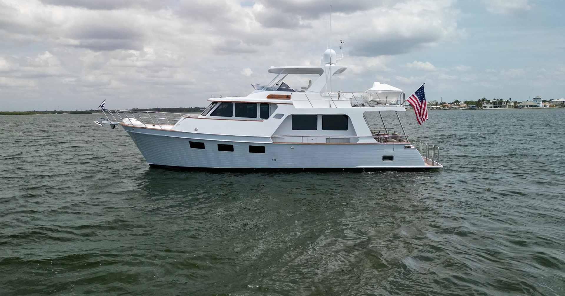 Easily accessible from the pilothouse via interior stairs, as well as from the aft cockpit by an exterior staircase, the flybridge is designed for seamless movement throughout the vessel. An L-shaped seating area, complemented by a fiberglass table and a convenient Frigibar (refrigerator/freezer), creates the perfect space for socializing whether underway or relaxing at the dock.