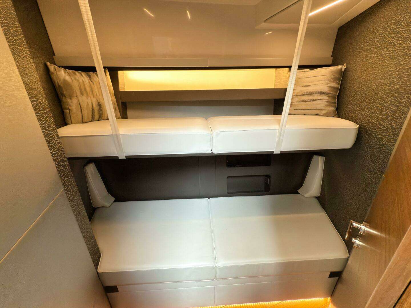 Side-Cabin: Third stateroom option with upper and lower single bunks that covert to couch. Hardwood flooring and build in indirect LED lighting. Ample storage and built in electrical outlets for charging devices.