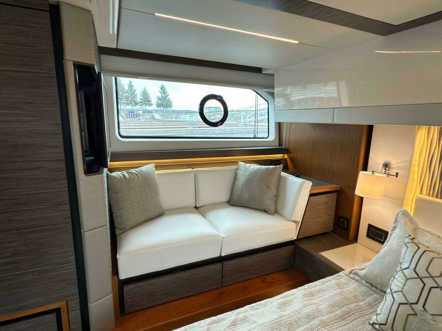 Mid-Cabin: Full beam owner's stateroom with large hull side windows, carpeted flooring and queen size pedestal berth with innerspring mattress plus storage under berth. Starboard side lounge and ample storage in hanging lockers and dresser drawers. Opening portholes in owner's stateroom and head.