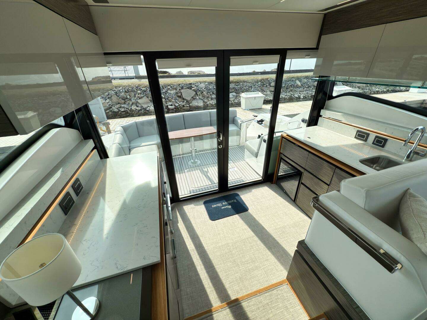 GALLEY: Large open galley with Quartz countertops on port and starboard. Six storage drawers on port side and two overhead cabinets on both port and starboard sides. Additional two large drawers under salon seating accessed from galley for easy access storage.